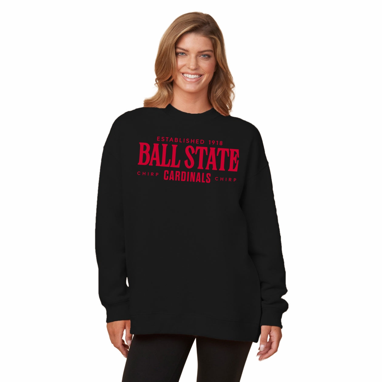 Go Cards! This Ball State sweatshirt is perfect for wearing to games or around campus. This women's pullover features a black body with a large red "Ball State Cardinals" alongside a smaller "Chirp Chirp" and "Established 1918". This Cardinals crewneck is great for showing your BSU spirit! This is an officially licensed collegiate product.