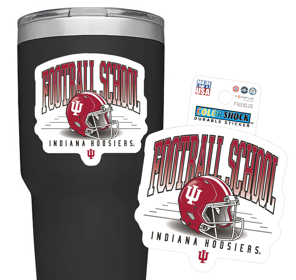 Hoo Hoo Hoosiers! This Indiana Football sticker is a must-have for any IU fan. This sticker features a white background with a red and black "Football School" arched over a helmet and IU wordmark that is perfect for showing your spirit. Make sure to grab this IU sticker to showcase your Hoosier pride! This is an officially licensed collegiate product.