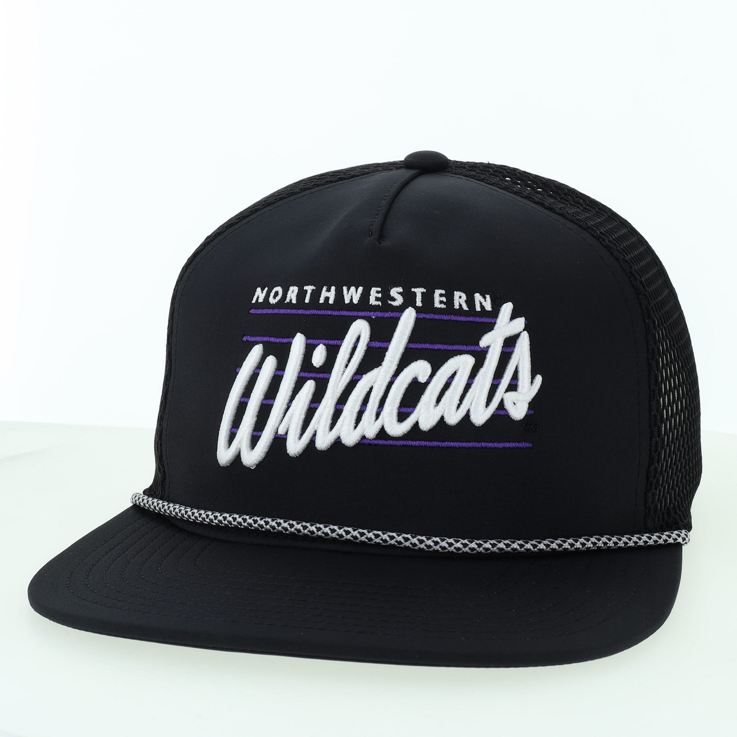 The Northwestern Wildcats Front Nine is our most technically advanced hat. The 5 Panel crown shape is a semi-structured, mid profile that features a new, large aperture performance mesh for unrivaled breathability. The 2-in-1 moldable memory visor enables The Front Nine to be worn as either a flat or curved brim. The no-sheen fabric and patterned paracord are exceptional details that make this style so unique.