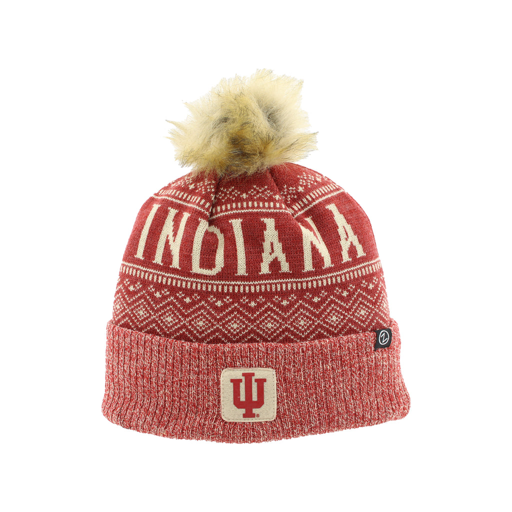Indiana Beanie Red/Khaki Fluffy Pom