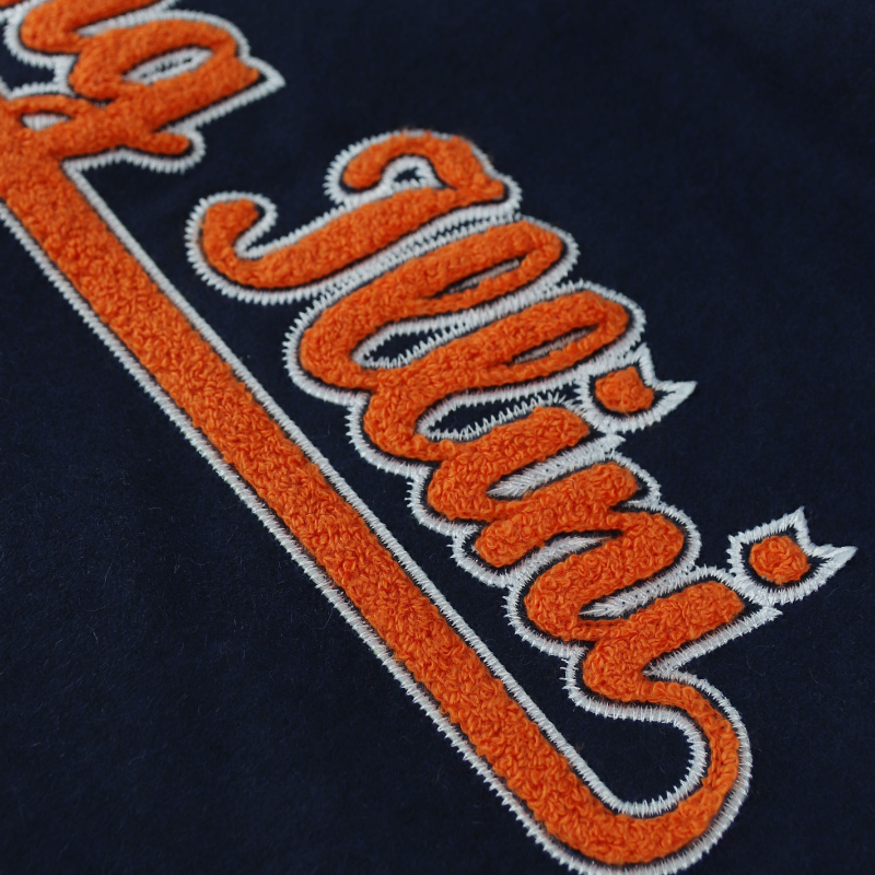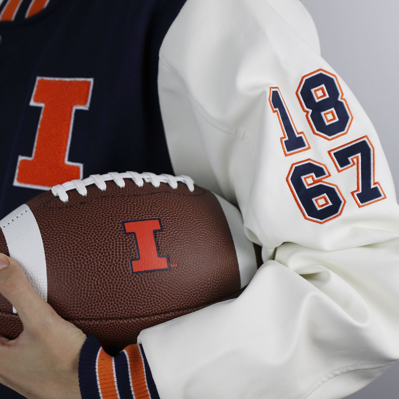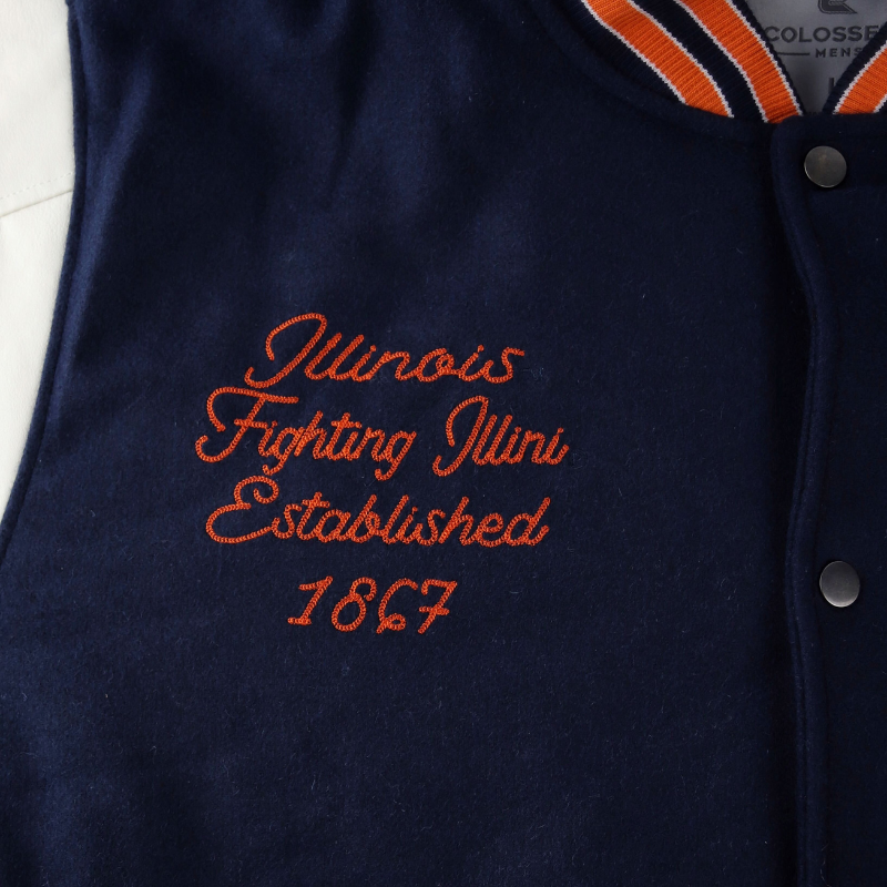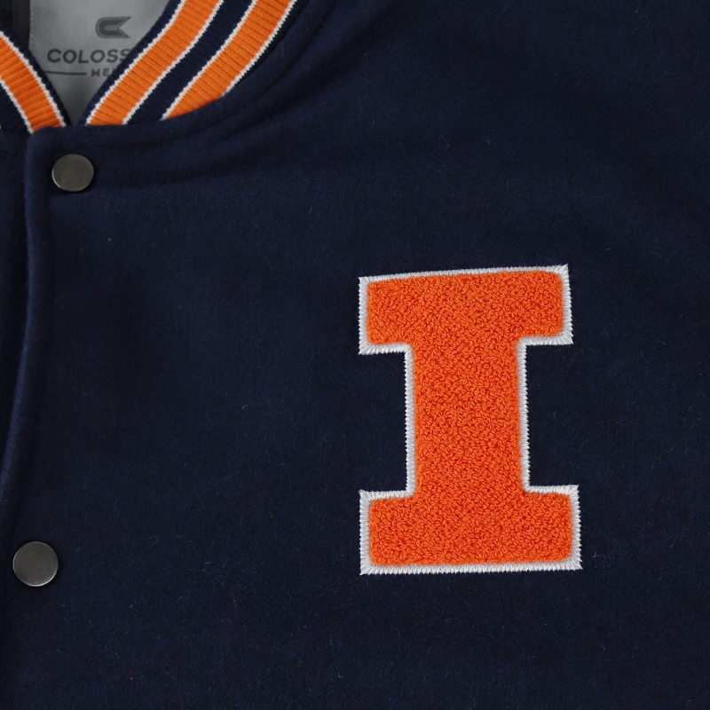 I-L-L! Pick up this Illinois jacket to impress your friends! Once they see you wearing this varsity letterman's jacket, they’re going to want one too! This jacket features a navy body with white sleeves, striped cuffs on the sleeves, collar, and waist, as well as multiple different Illinois designs on the chest/arms perfect for showing your Illini spirit at games, tailgates, or just around campus. This is an officially licensed collegiate product.