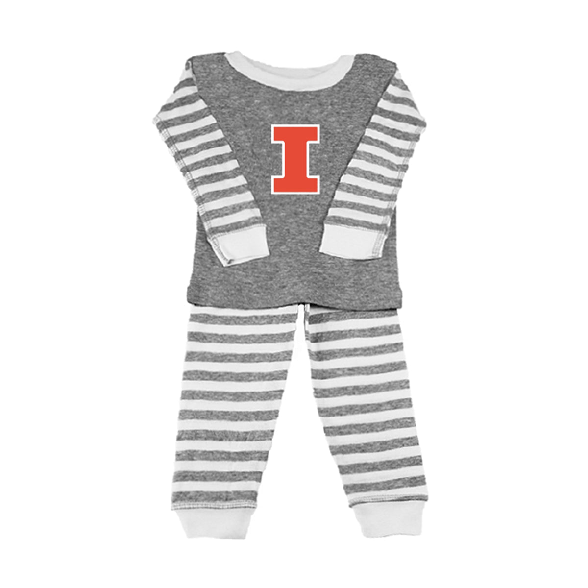 Hail to the orange! This Illinois infant pajama set is a great way to show your little one's Fighting Illini spirit! These pajamas feature a solid grey body with striped arms and pants, alongside an orange Block I that is great for any occasion. Make sure to pick up this pajama set to show off your little one's Illini pride! This is an officially licensed collegiate product.