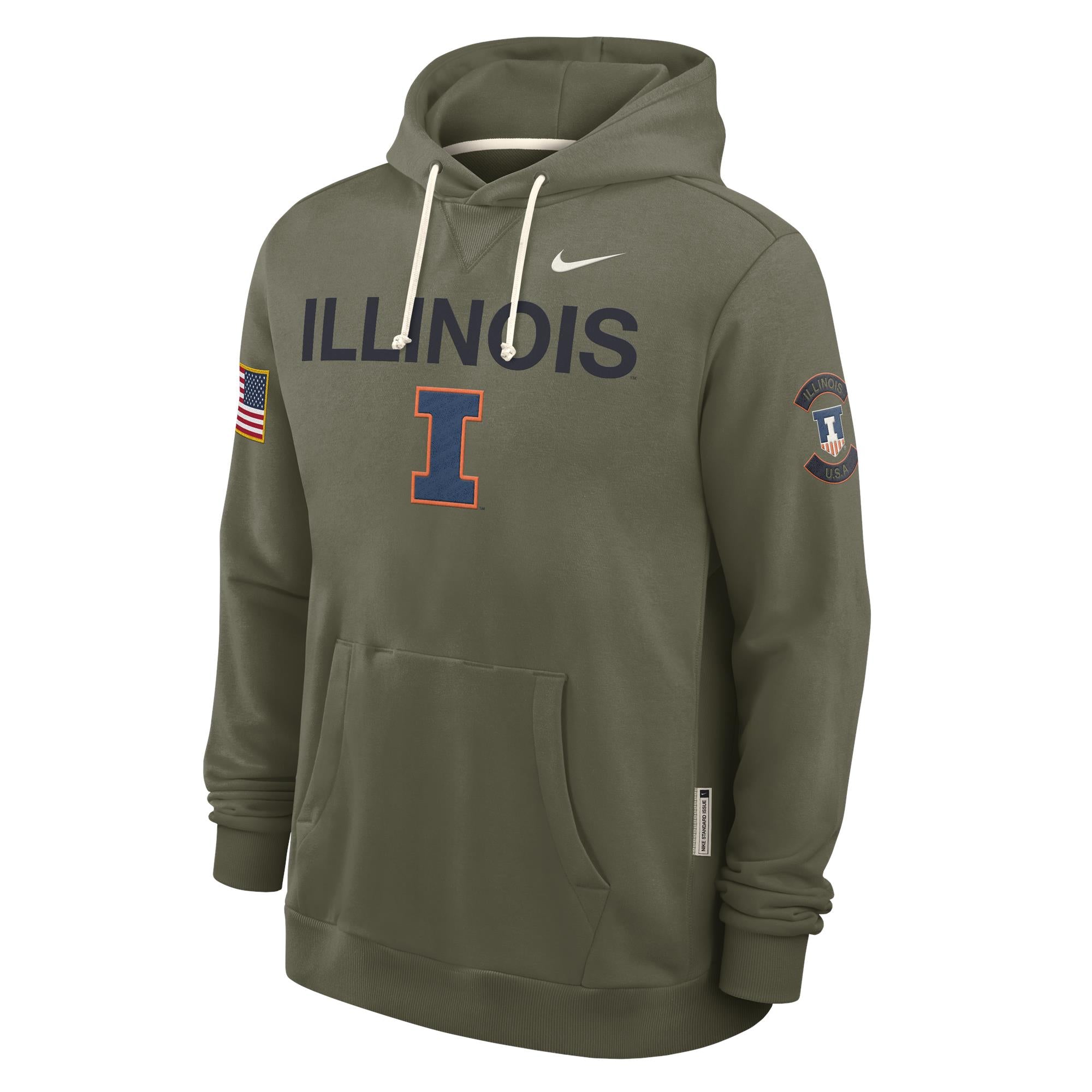 Show your Orange and Blue pride! This Illinois hoodie is perfect for any Illini fan. This hoodie features an olive-colored body with a bold "Illinois" on the chest alongside a navy/orange Block I, an American flag on the right sleeve, and a shield patch on the left sleeve that makes it great for games, tailgates, or campus wear. Don’t miss out on this new Nike hoodie to show your Fighting Illini spirit! This is an officially licensed collegiate product.