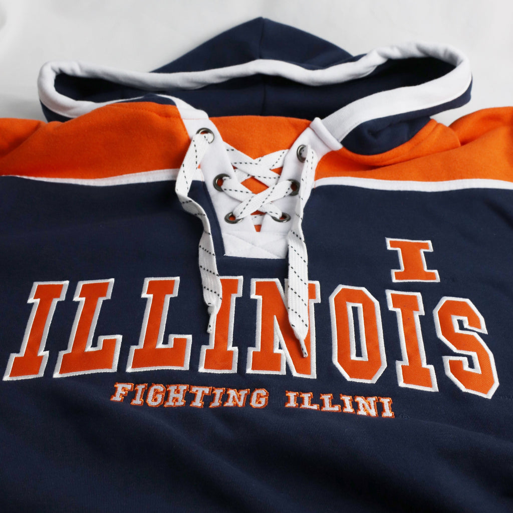 Make a bold statement as a super fan with the Illinois Fighting Illini Navy Hockey Hoodie! This heavyweight navy sweatshirt features vibrant orange and white trim, a hockey-style lace-up placket, and high-quality sewn lettering spelling out "Illinois Fighting Illini" across the front, showcasing your unwavering team pride. Crafted for durability and warmth, this premium hoodie offers a cozy, relaxed fit with a kangaroo pocket and adjustable drawstrings, perfect for chilly days or casual outings. Designed for the ultimate Illini supporter, this unisex piece is a must-have for repping your team with standout style. Grab yours now and show your Fighting Illini spirit!