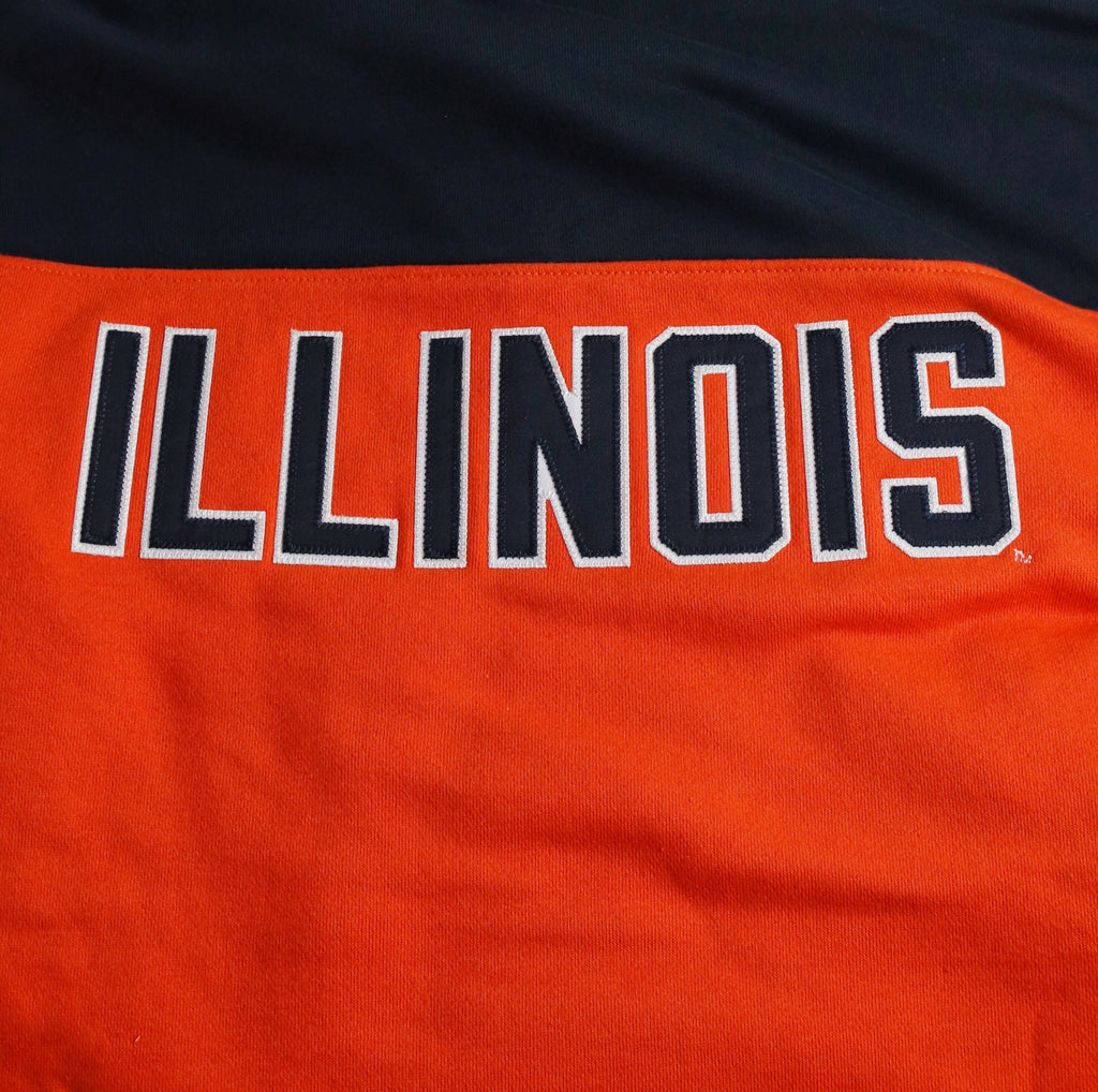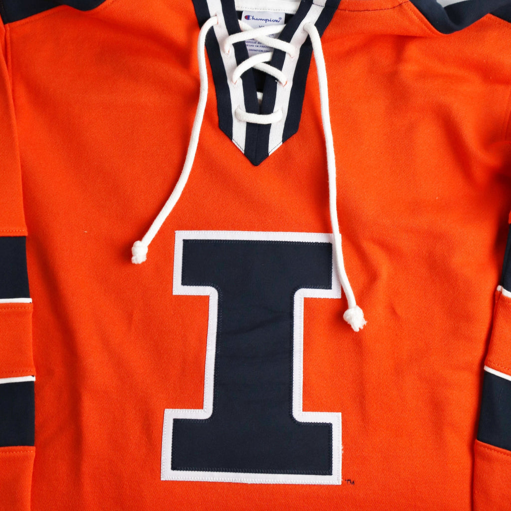 Hail to the orange! This Illinois hockey jersey is a great way to show your Fighting Illini spirit! This hooded jersey features an orange body with navy stripes on the sleeves/torso, a navy Block I on the front, and a navy Illinois/hood on the back that make it great for any occasion. Make sure to pick up this Illinois hoodie to show off your Illini pride! This is an officially licensed collegiate product.