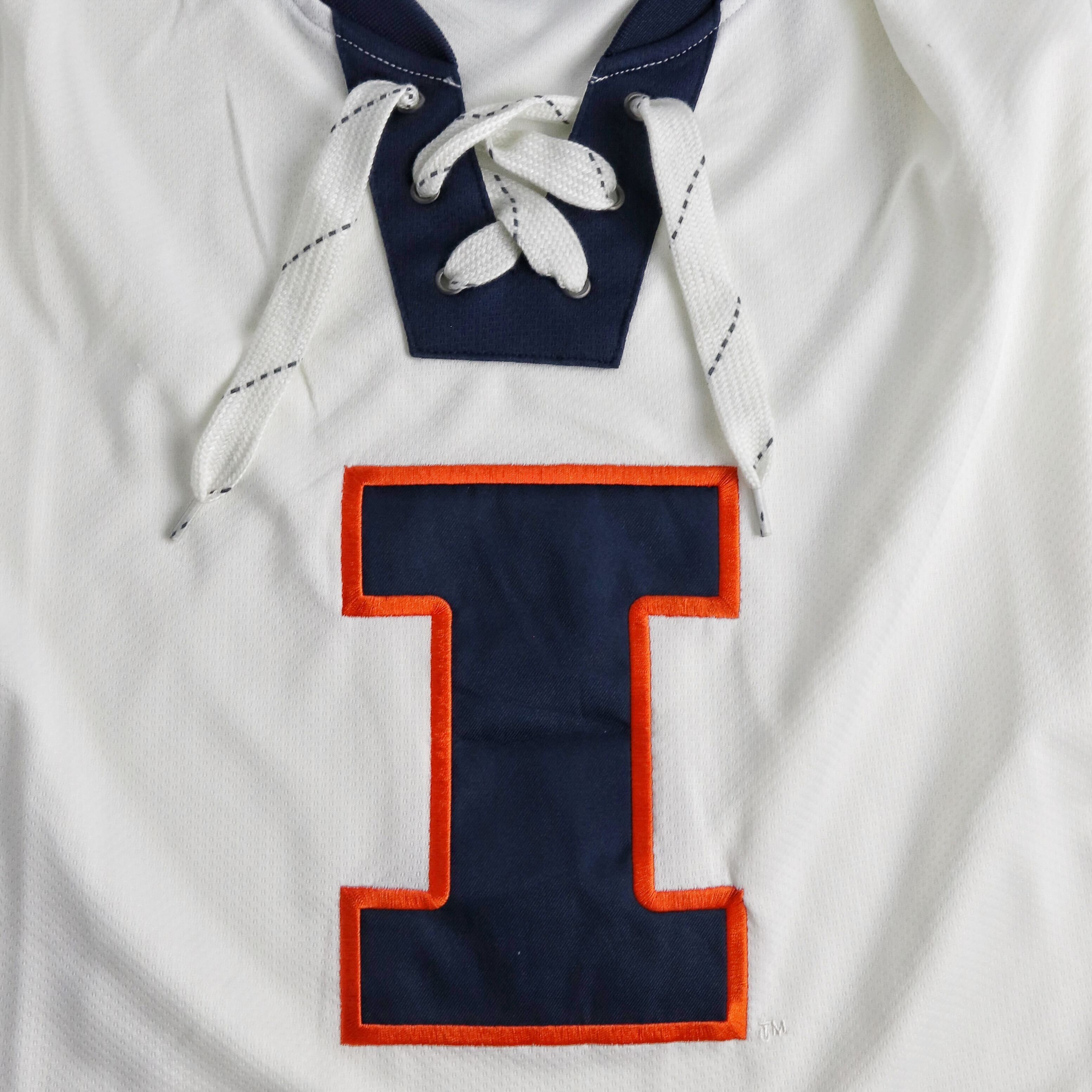 Go Illini! This Illinois hockey jersey is perfect for wearing around campus or to games. This jersey features a white body with navy/orange stripes on the arms and torso alongside a bold Block I on the chest. This Illinois merch is great for showing your Fighting Illini spirit! This is an officially licensed collegiate product.