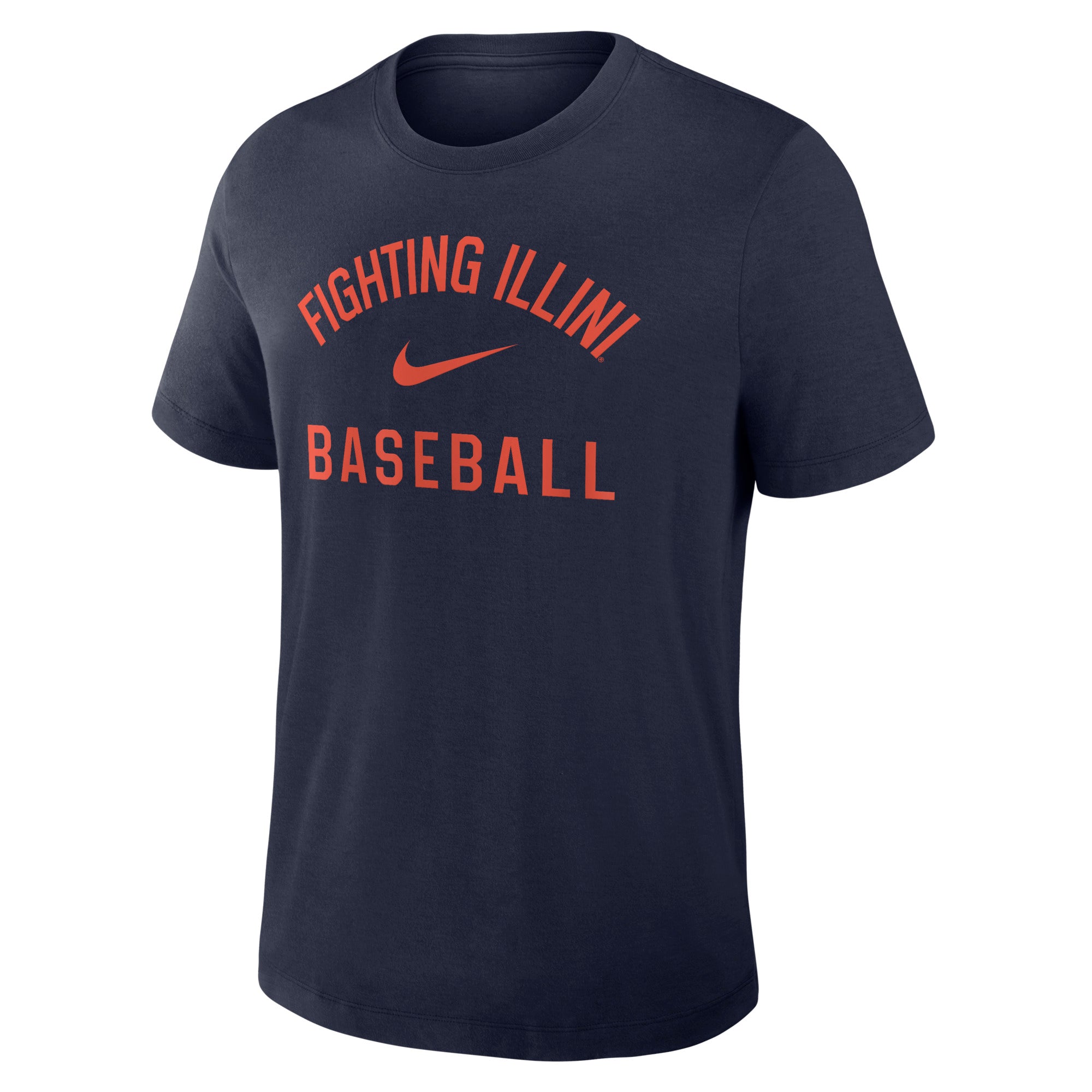 Represent the Illini everywhere you go with this Illinois Baseball shirt! This Nike tee comes with a navy body with an orange "Fighting Illini Baseball" and Nike swoosh that makes it a must-have. Whether you’re in the stands or walking across campus, this baseball t-shirt will keep your Fighting Illini spirit strong! This is an officially licensed collegiate product.