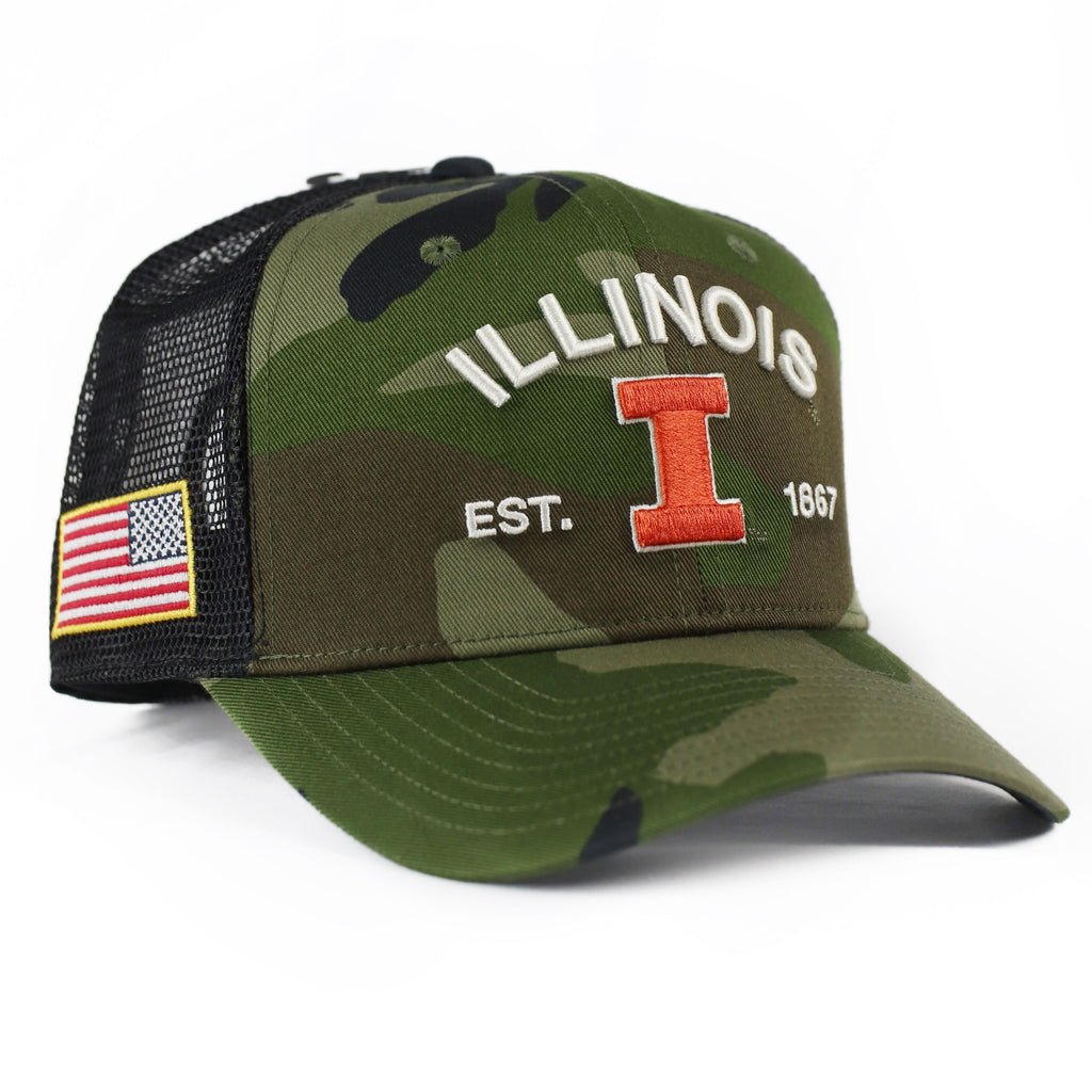 Go Illini! This Illinois hat is perfect for wearing around campus or to games. This Nike hat features a camo front with an orange/cream Illinois design, with a black mesh backing/adjustable snapback. This military appreciation hat is great for showing your Fighting Illini spirit! This is an officially licensed collegiate product.