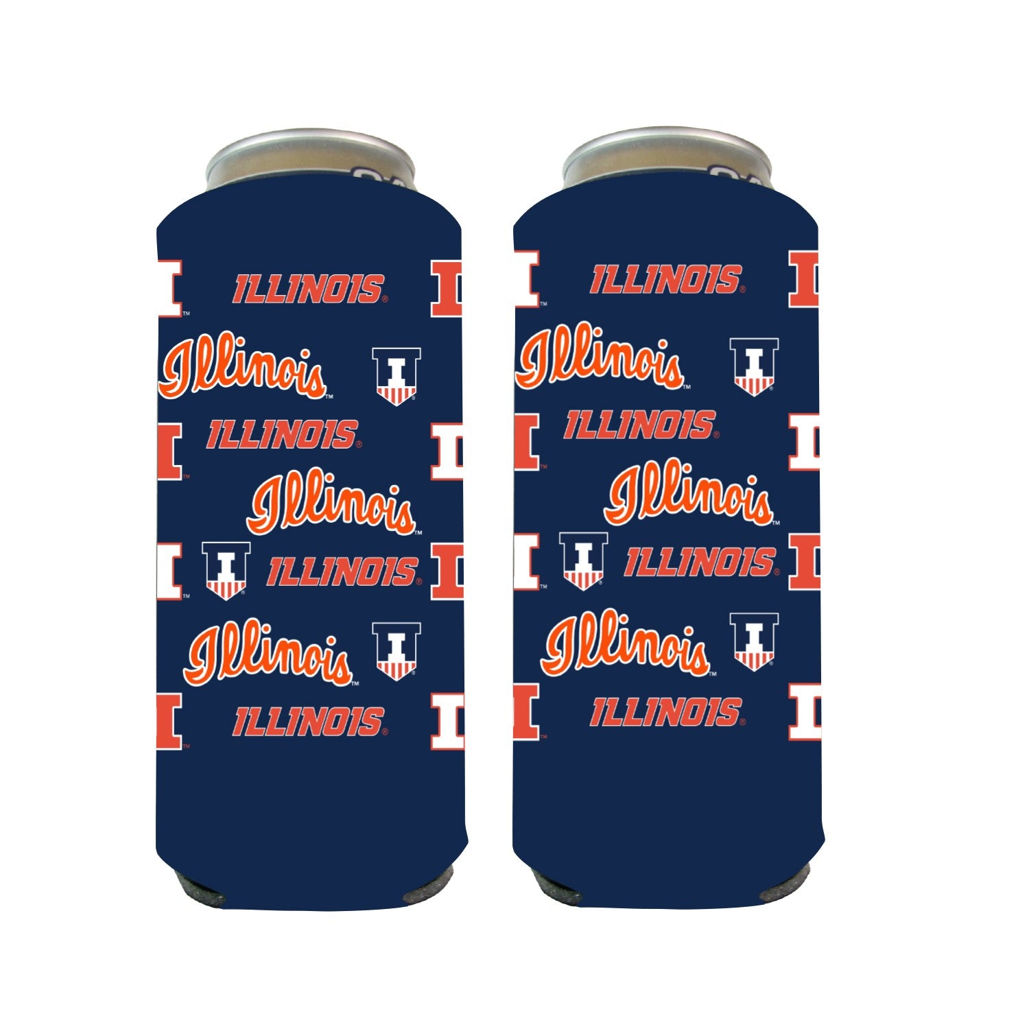 Go Illini! This Illinois can koozie is perfect for games or tailgates! This 24oz koozie features a navy body with a variety of orange and white Illinois logos that will really make your Fighting Illini spirit shine through! This is an officially licensed collegiate product.