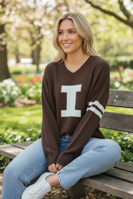 Go Illini! This Newport Knits Illinois Fighting Illini sweater is perfect for wearing around campus or to games. This sweater features a chocolate body with a Block I on the front and “U of I” on the back. This Fighting Illini chocolate sweater is great for showing your Fighting Illini spirit! This is an officially licensed collegiate product.