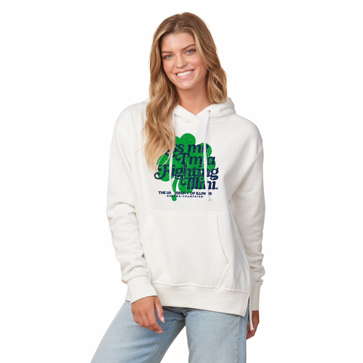 Represent the Illini everywhere you go with this Illinois hoodie! This women's fleece pullover comes with a white body with a navy "Kiss Me, I'm a Fighting Illini" and green clover on the front that makes it a must-have. Whether you’re in the stands or walking across campus, this new Fighting Illini hoodie will keep your St Paddy's spirit strong! This is an officially licensed collegiate product.
