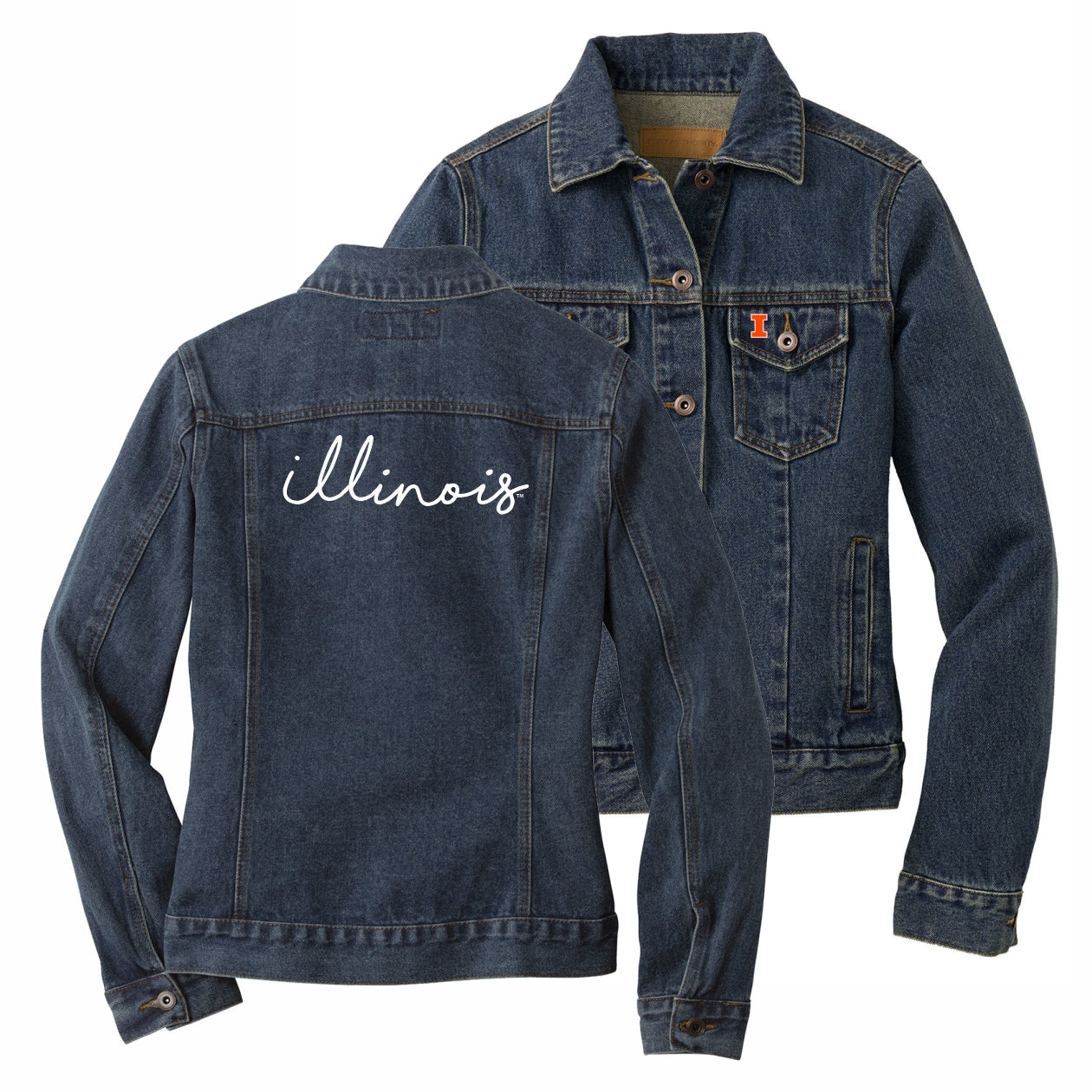 Show your Orange and Blue pride! This Illinois jacket is perfect for any Illini fan. This women's jacket features a denim body with a white script Illinois on the back and an orange Block I on the front pocket that makes it great for games, tailgates, or campus wear. Don’t miss out on this new U of I jacket to show your Fighting Illini spirit! This is an officially licensed collegiate product.