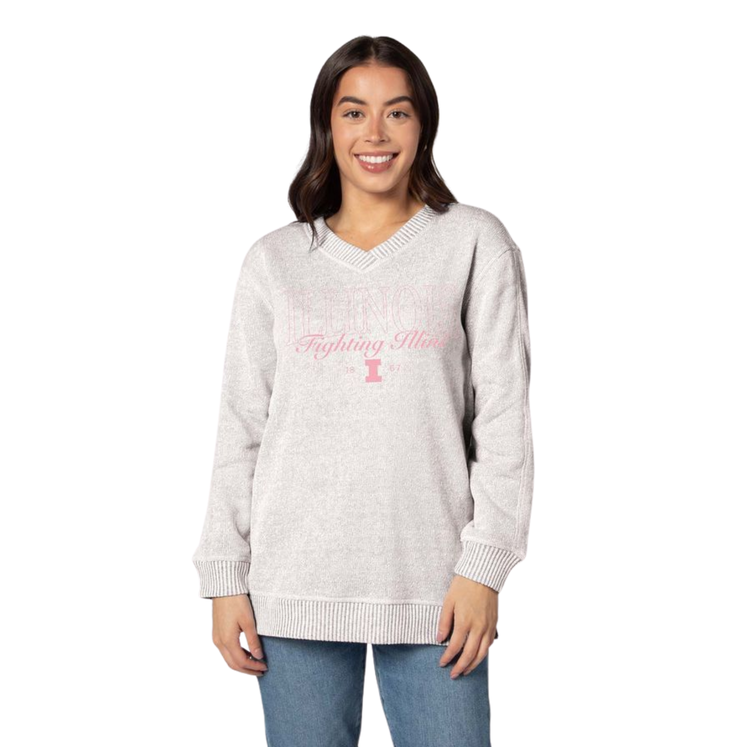I-L-L! Pick up this Illinois sweater to impress your friends! Once they see you wearing this women's v-neck sweater, they’re going to want one too! This Illinois gear features a light tan body with a pink Illinois design on the front perfect for showing your Illini spirit at games, tailgates, or just around campus. This is an officially licensed collegiate product.