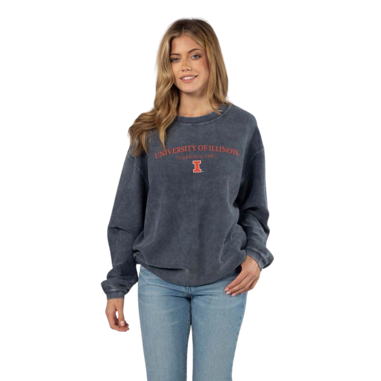 Hail to the orange! This Illinois sweatshirt is a great way to show your Fighting Illini spirit! This women's crewneck pullover features a textured navy body with an orange "University of Illinois" and Block I on the front that is great for any occasion. Make sure to pick up this new U of I gear to show off your Illini pride! This is an officially licensed collegiate product.