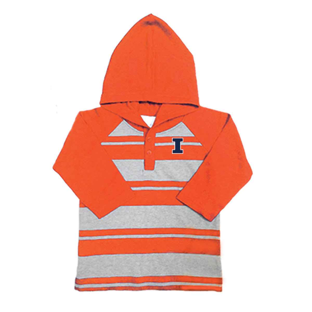 I-L-L! Pick up this Illinois toddler shirt for your little one! Once you see them wearing this hooded tee, you're going to want one too! This hooded shirt features an orange/grey striped body with a navy Block I perfect for showing your little one's Illini spirit at games, tailgates, or just around campus. This is an officially licensed collegiate product.