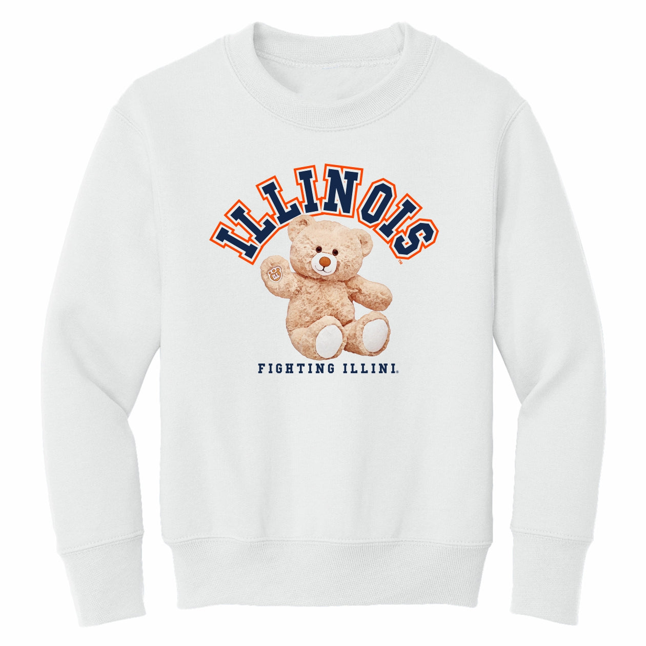 Go Illini! This kids Illinois sweatshirt is perfect for your little Illini fan! This crewneck pullover features a white fleece body with an orange/navy Illinois arched over a friendly stuffed light brown bear that will really make your kiddo's Illinois spirit shine through! This is an officially licensed collegiate product.