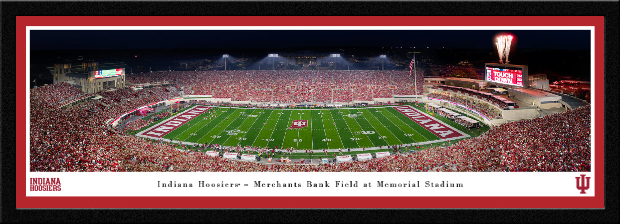 This panorama of Memorial Stadium highlights the views from an Indiana Hoosiers football game. Memorial Stadium is located in Bloomington, Indiana and was opened in 1960. After many renovations, the current stadium's seating capacity holds 52,692. The Indiana Hoosiers football program began in 1887, and the team competes in the Big Ten Conference. Established in 1820 as the Indiana State Seminary, eight years later the name was changed to Indiana College and officially changed to Indiana University in 1838. Indiana University enrolls over 110,000 students at all IU campuses.