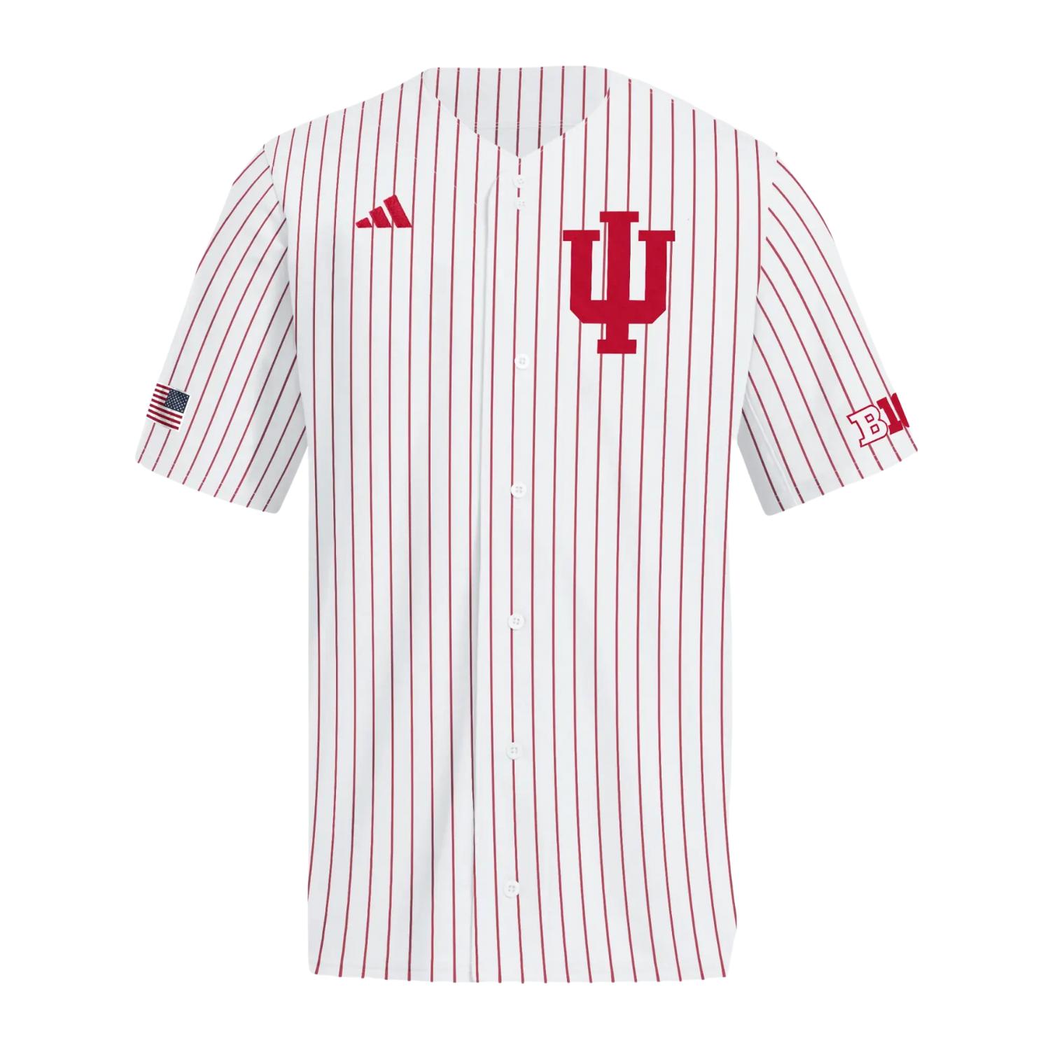 Go Hoosiers! This Indiana Baseball jersey is great for wearing to a game or just around campus! Featuring a white body with red pinstripes and a large red IU trident on the front, you will love this Hoosiers Baseball merch. This IU jersey makes it easy to show off your Indiana pride! This is an officially licensed collegiate product.