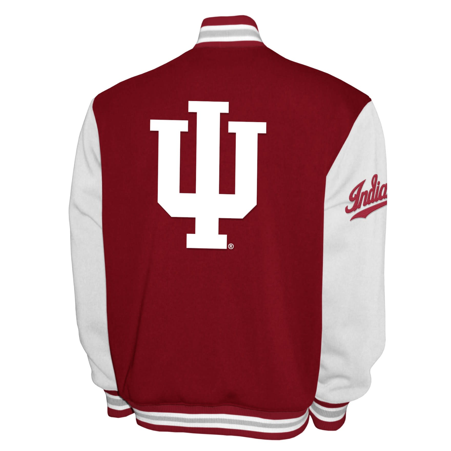 Show your Hoosier pride in this new Indiana jacket! This vintage letterman-style jacket features a red body with white sleeves and a variety of white IU designs on the front/back perfect for showing off around campus. Impress your friends with this new Hoosiers jacket and make them wish they had one too! This is an officially licensed collegiate product.