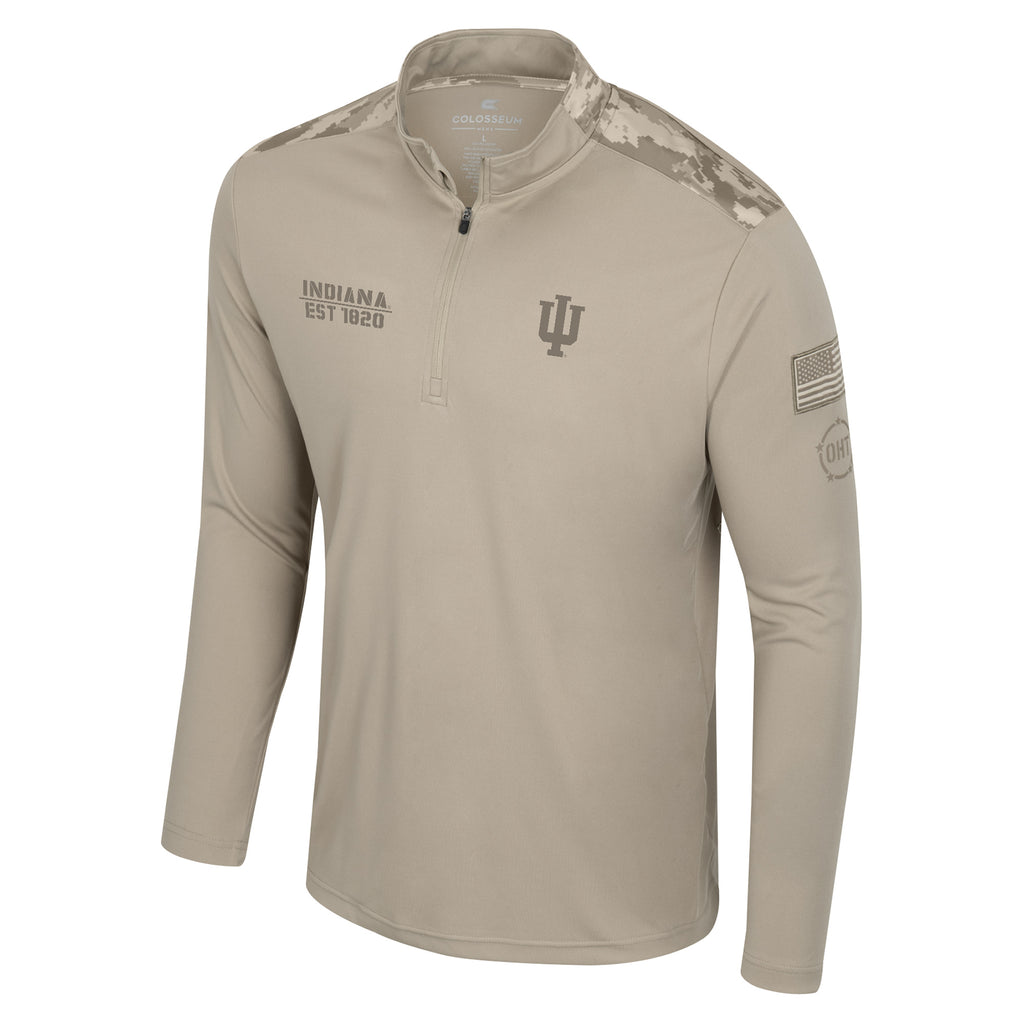 Show your Hoosier pride in this new Indiana quarter-zip! This men's pullover features a tan body with camo accents, an American flag on the left sleeve, and darker tan IU designs on the front perfect for showing your appreciation for our military. Impress your friends with this Operation Hat Trick piece and make them wish they had one too! This is an officially licensed collegiate product.
