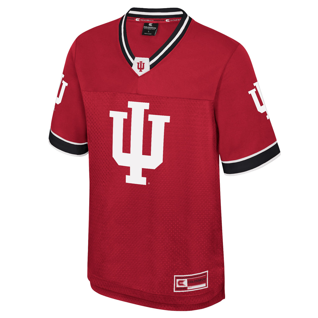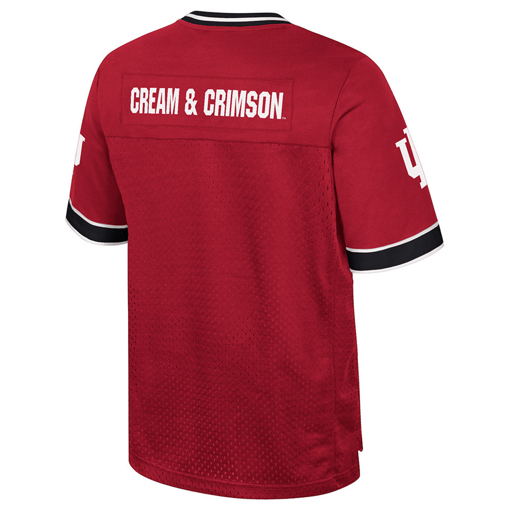 Show your candy-stripe pride with this new Indiana Football jersey! This jersey features a red body with a white IU trident on the front, alongside black accents on the sleeves/neck, and a white "Cream & Crimson" on the back that makes it stand out. Whether you’re at Assembly Hall or walking across campus, this IU Football jersey is the perfect way to rep Indiana! This is an officially licensed collegiate product.