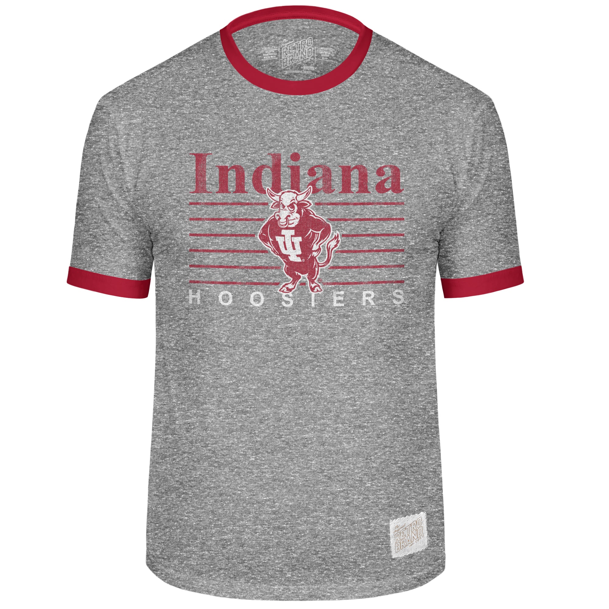 Celebrate your Hoosier spirit with the Indiana Hoosiers Retro Brand Vintage Bison Ringer Tee! This stylish t-shirt features a super-soft tri-blend grey body paired with striking crimson sleeves, offering both comfort and bold team pride. The distressed, iconic Indiana Hoosiers vintage bison graphic printed on the front adds a timeless, retro flair, perfect for game days or everyday wear. A must-have for any IU fan, this ringer tee blends classic style with modern comfort. Grab yours now and show off your Hoosiers love!
