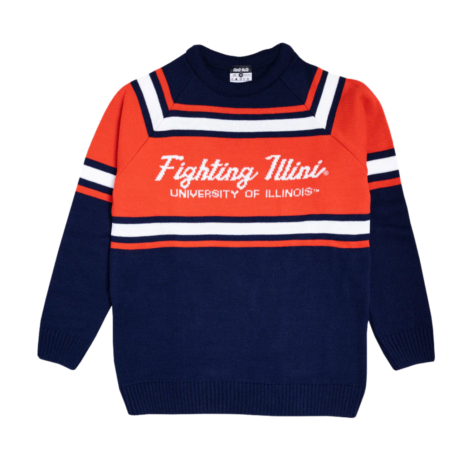 I-L-L! Pick up this Illinois sweater to impress your friends! Once they see you wearing this Charlie Hustle crewneck sweater, they’re going to want one too! This sweater features a navy body with orange/white stripes and a script "Fighting Illini" on the front, perfect for showing your Illini spirit at games, tailgates, or just around campus. This is an officially licensed collegiate product.