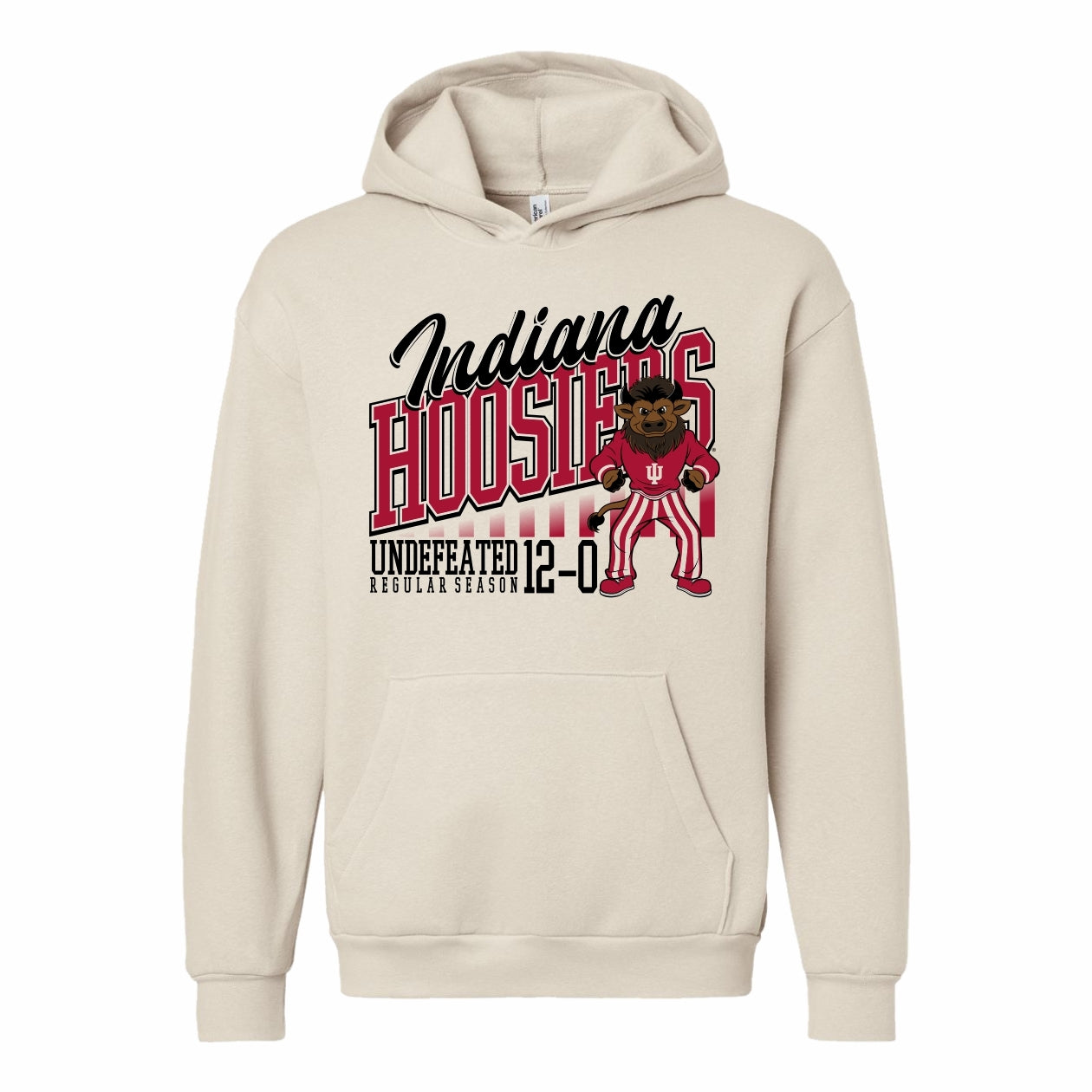 Celebrate the Indiana Hoosiers’ historic undefeated regular season with this limited-edition tan-colored hoodie! Featuring a bold Hoosier the Bison graphic on the front, this commemorative hoodie is the ultimate collectible for true fans. Soft, premium material ensures all-day comfort while honoring an unforgettable milestone in IU Football history. Exclusively available at the official Indiana Shop - grab yours before this once-in-a-lifetime piece is gone!