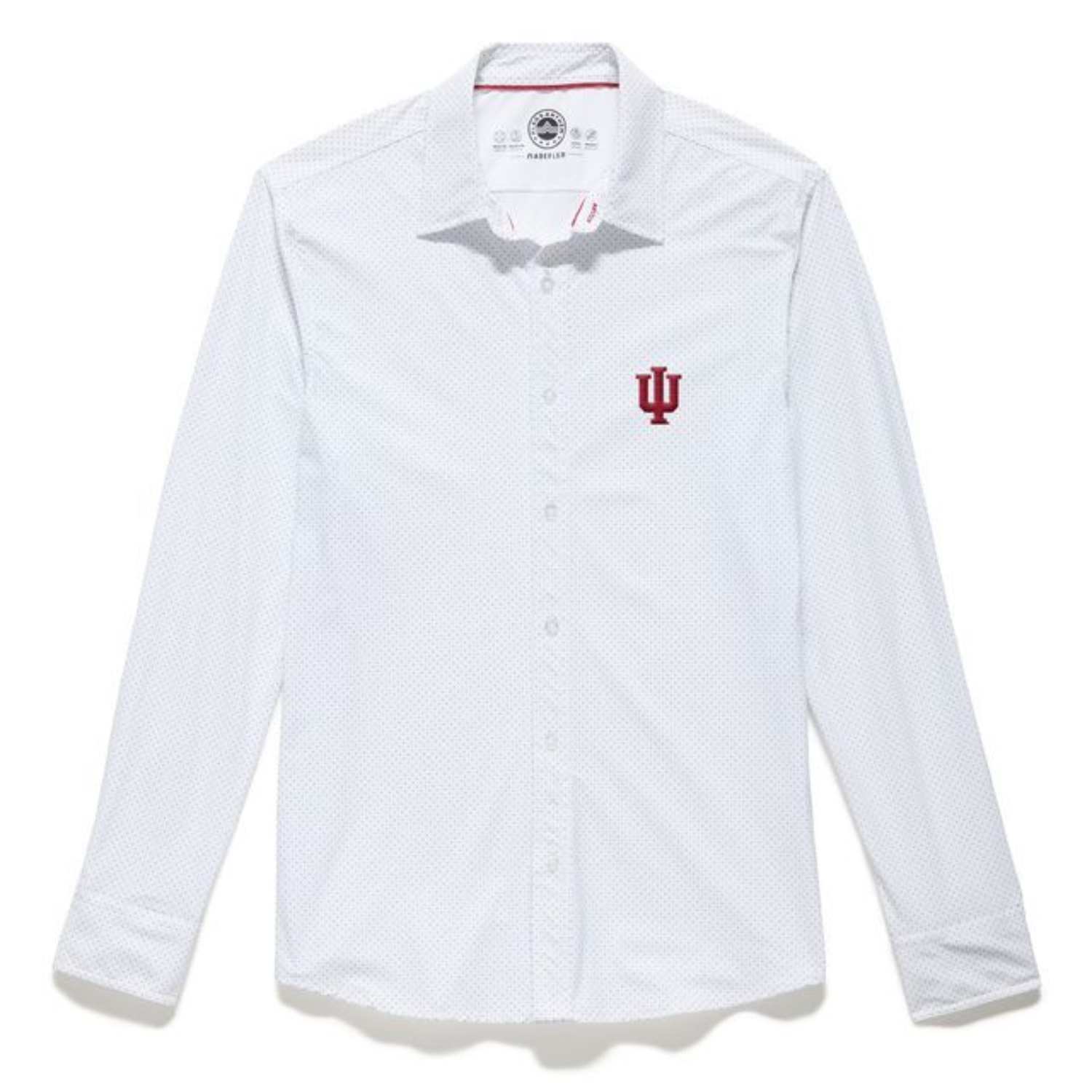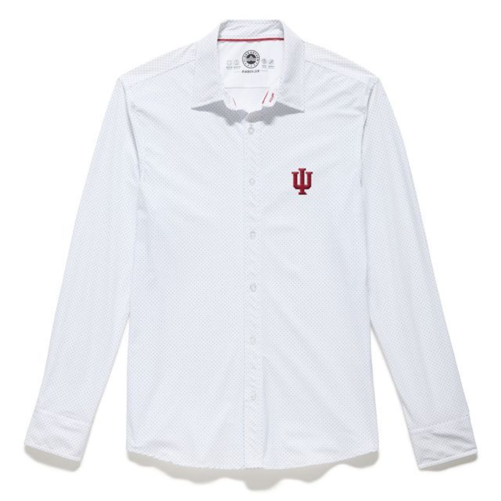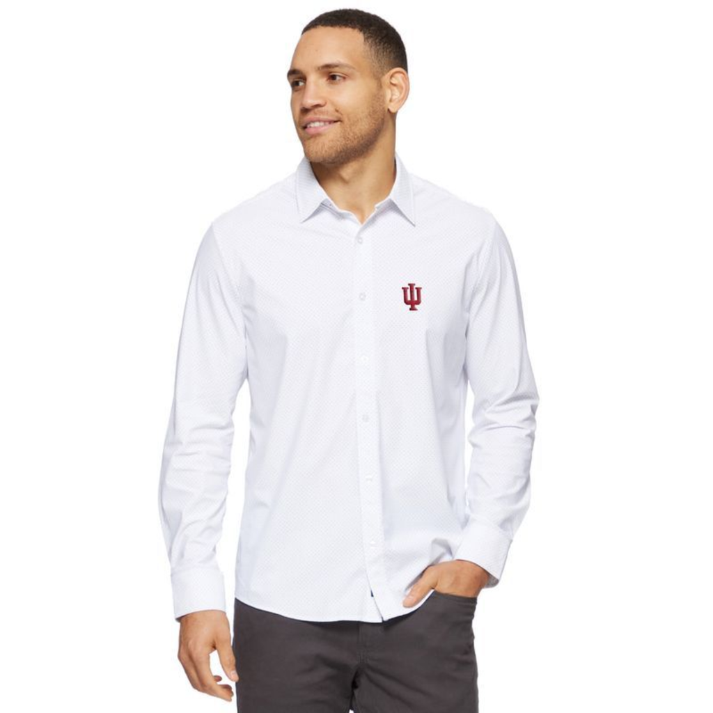 Go IU! Fight! Fight! Fight! This Indiana shirt will show that you are a true fan and is perfect for game days! This men's button-up shirt features a white body with a subtle dot pattern and a red IU trident on the left chest. Make sure to get this Hoosiers shirt today! This is an officially licensed collegiate product.