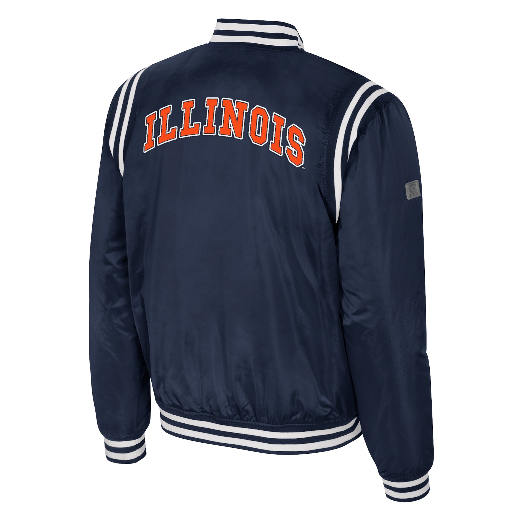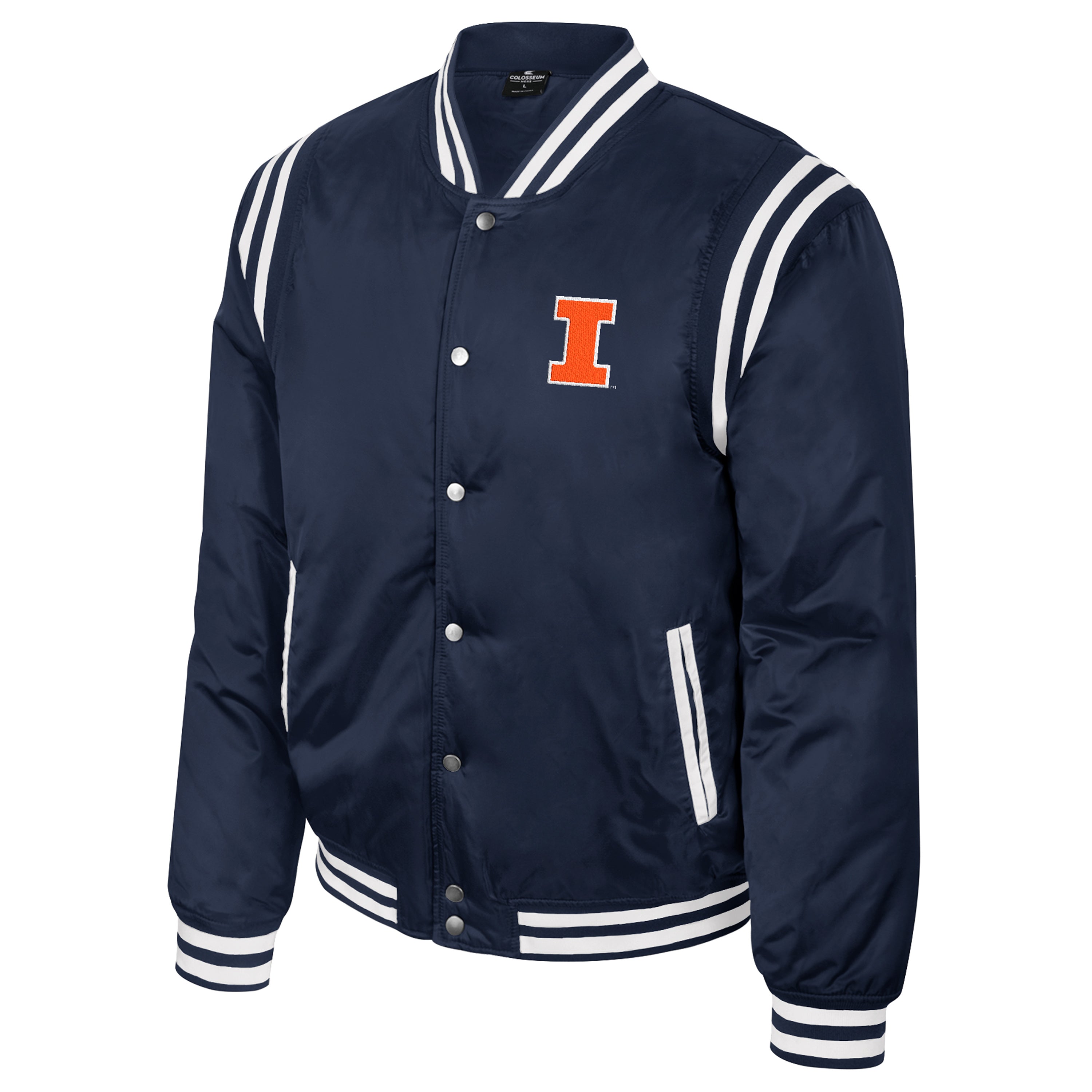 Hail to the orange! This Illinois jacket is a great way to show your Fighting Illini spirit! This bomber jacket features a navy body with white striped cuffs on the sleeves, waist, neck, and shoulders, alongside an orange Block I on the left chest that is great for any occasion. Make sure to pick up this new Fighting Illini jacket to show off your Illinois pride! This is an officially licensed collegiate product.