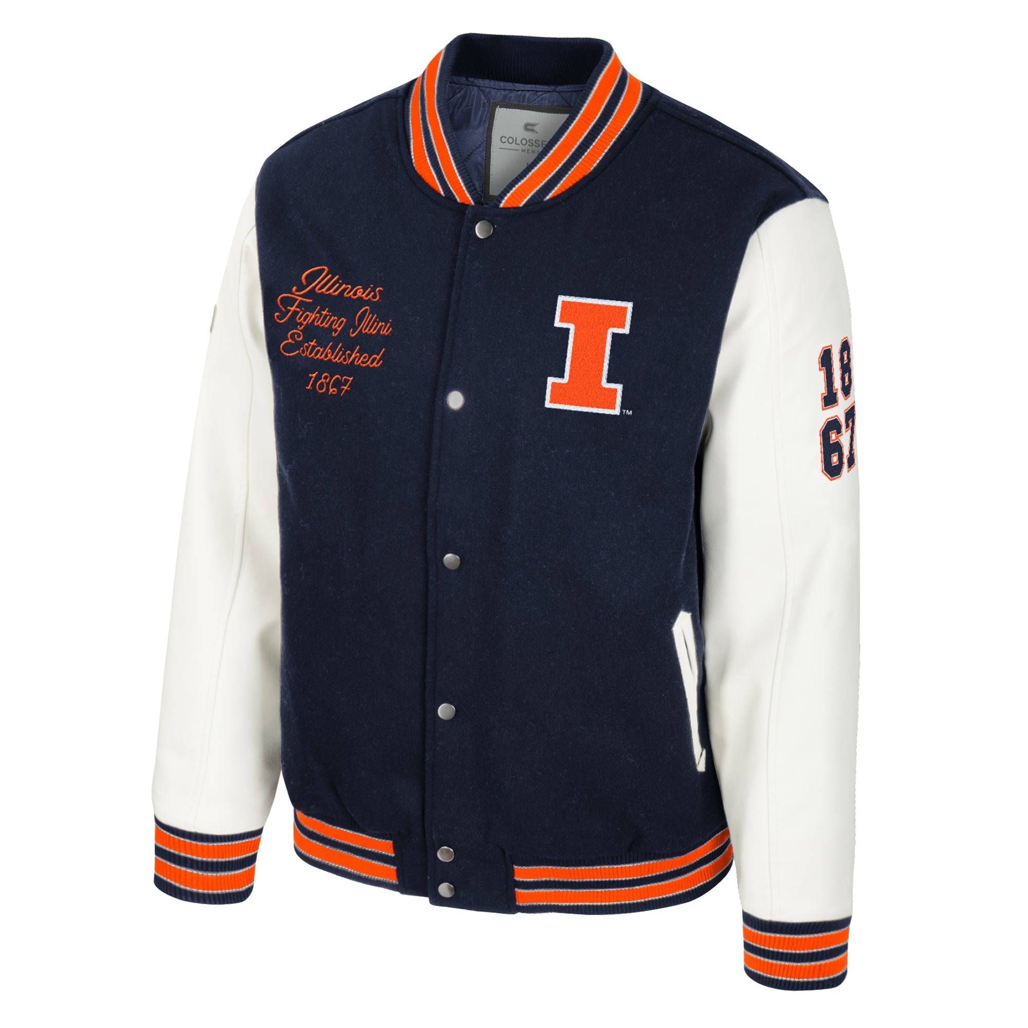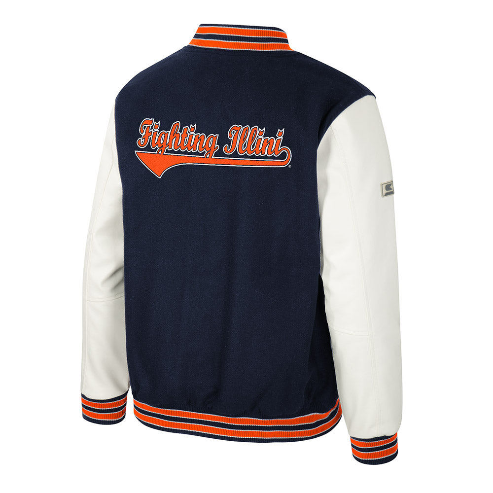 I-L-L! Pick up this Illinois jacket to impress your friends! Once they see you wearing this varsity letterman's jacket, they’re going to want one too! This jacket features a navy body with white sleeves, striped cuffs on the sleeves, collar, and waist, as well as multiple different Illinois designs on the chest/arms perfect for showing your Illini spirit at games, tailgates, or just around campus. This is an officially licensed collegiate product.