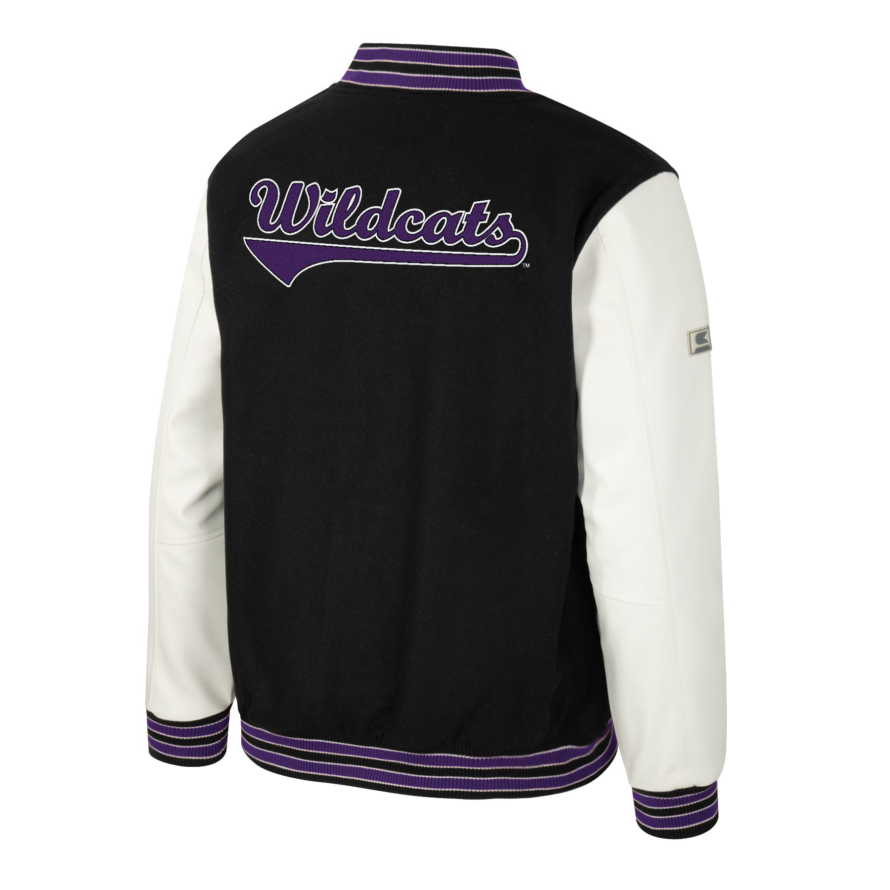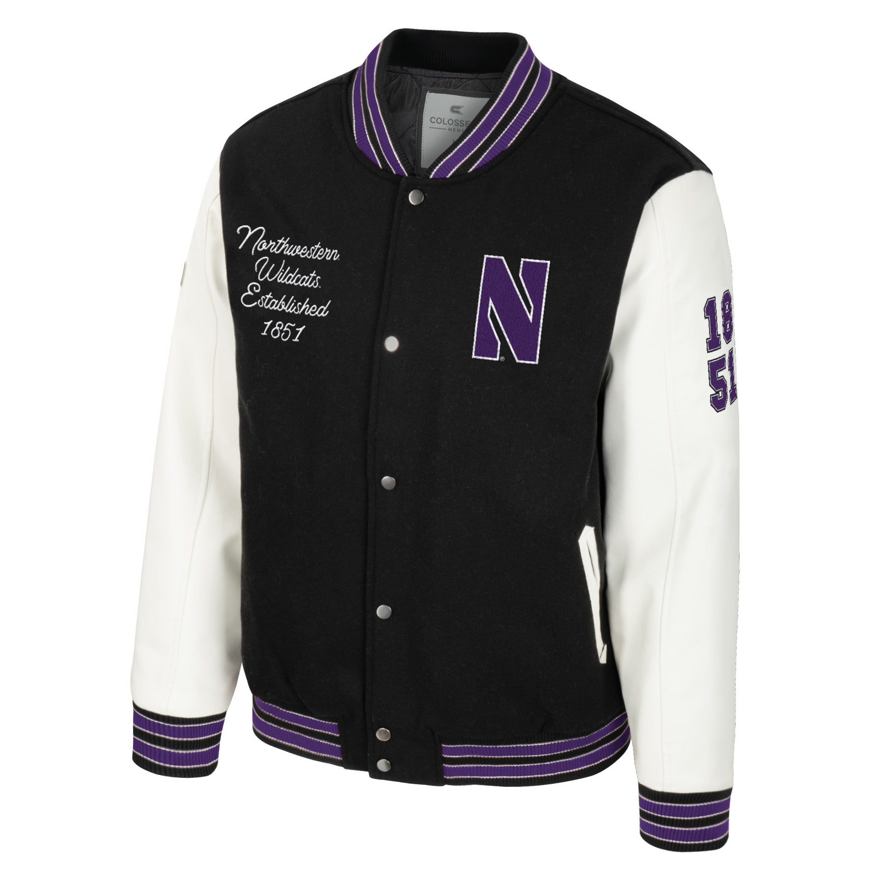 Hail to the Purple! This Northwestern jacket is a great way to show your Wildcat spirit! This letterman jacket features a black and white body with a script Northwestern design on the right chest, a purple N logo on the left chest, purple/black striped cuffs, and a purple script "Wildcats" on the back that is great for any occasion. Make sure to pick up this new NU jacket to show off at games! Shop the Official Team Store of Northwestern Athletics for Northwestern apparel or gifts! This is an officially licensed collegiate product.
