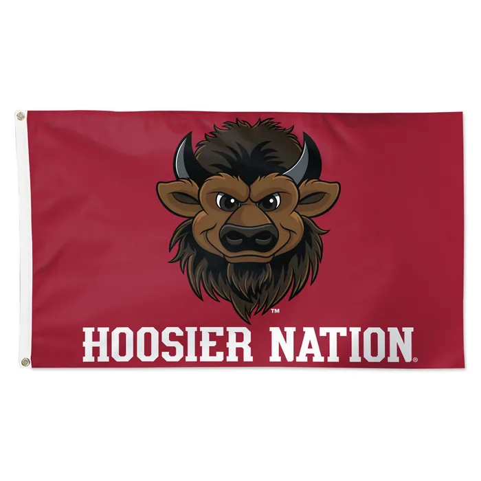 Show your Hoosier pride with this new Indiana Bison flag! This flag features a red body with a white "Hoosier Nation" under an image of Hoosier the Bison that will make a great addition to your Indiana decor. Make sure to pick up this IU flag in-store or online! This is an officially licensed collegiate product.