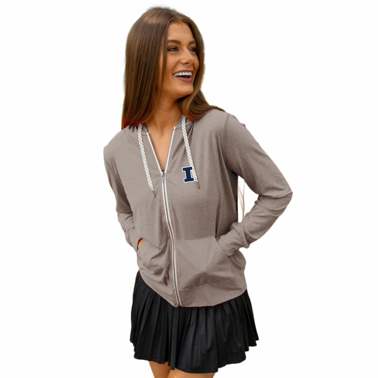 Hail to the orange! This Illinois hoodie is a great way to show your Fighting Illini spirit! This women's full-zip sweatshirt features a lightweight, light brown body with a navy/white Block I on the front that is great for any occasion. Make sure to pick up this new U of I hoodie to show off your Illini pride! This is an officially licensed collegiate product.