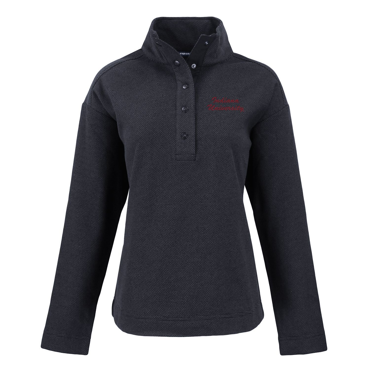 Show your candy-stripe pride with this Indiana jacket! This women's Cutter & Buck pullover features a black body with a snap top closure and a red script "Indiana University" on the left that makes it stand out. Whether you’re at Assembly Hall or walking across campus, this Hoosiers jacket is the perfect way to rep Indiana! This is an officially licensed collegiate product.
