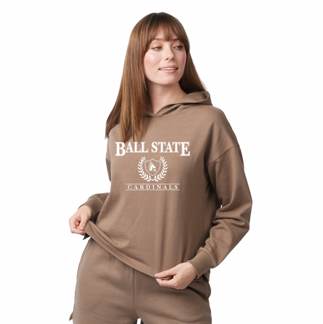 Go Cardinals! Get this Ball State hoodie and everyone will be able to see your BSU pride! When you wear this women's sweatshirt to the next game, you will stand out in the crowd! This pullover hoodie features a light brown body with a white "Ball State Cardinals" and shield laurel on the front. Get one today to show your Cardinal spirit! This is an officially licensed collegiate product.