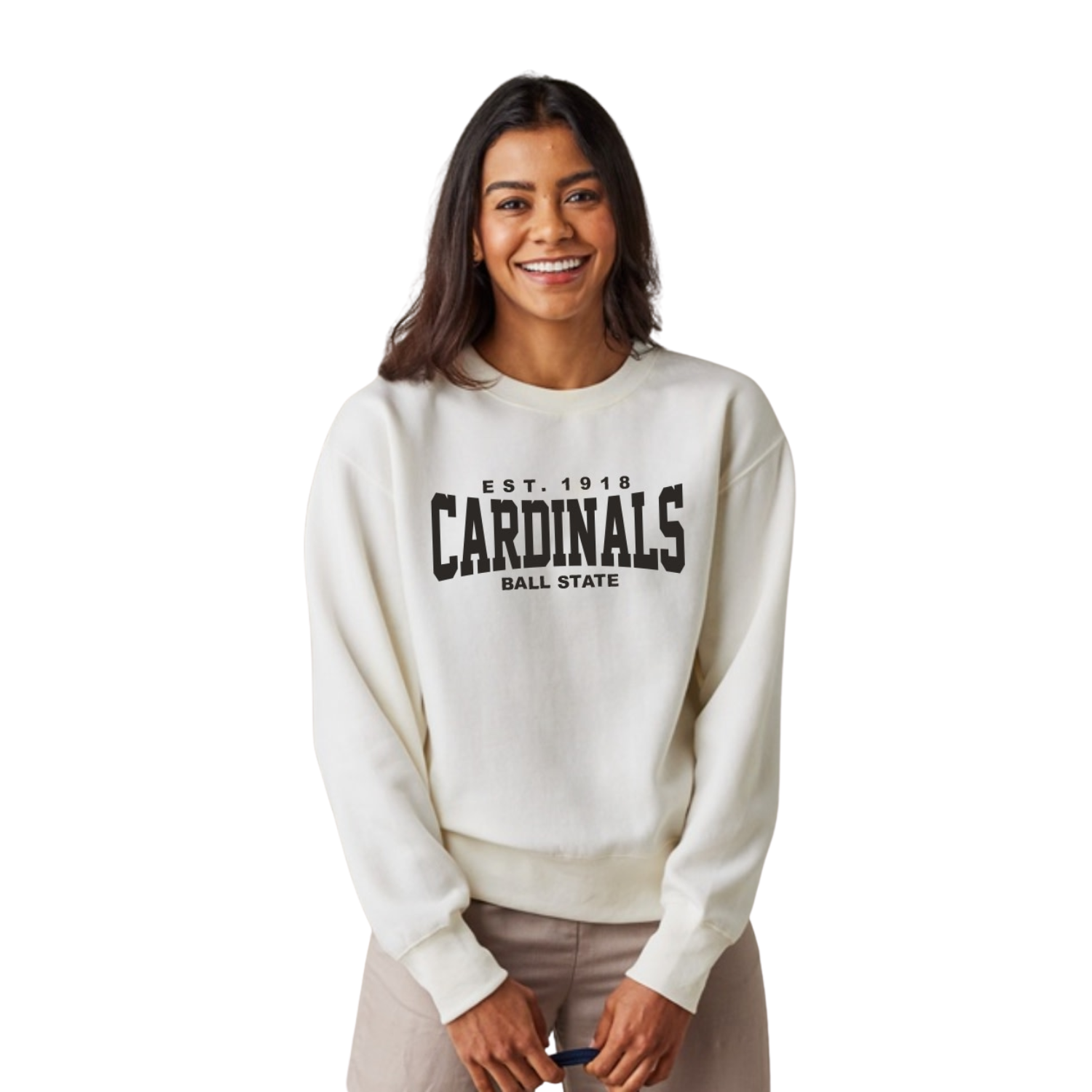 Go Cardinals! This Ball State women's sweatshirt is a perfect way to show your Cardinal spirit. This fleece crewneck features an off-white body with a large black "Cardinals" between "Est. 1918" and "Ball State" that makes it great for campus wear, games, and more. Get this stylish new pullover today to show off your Ball State pride! This is an officially licensed collegiate product.