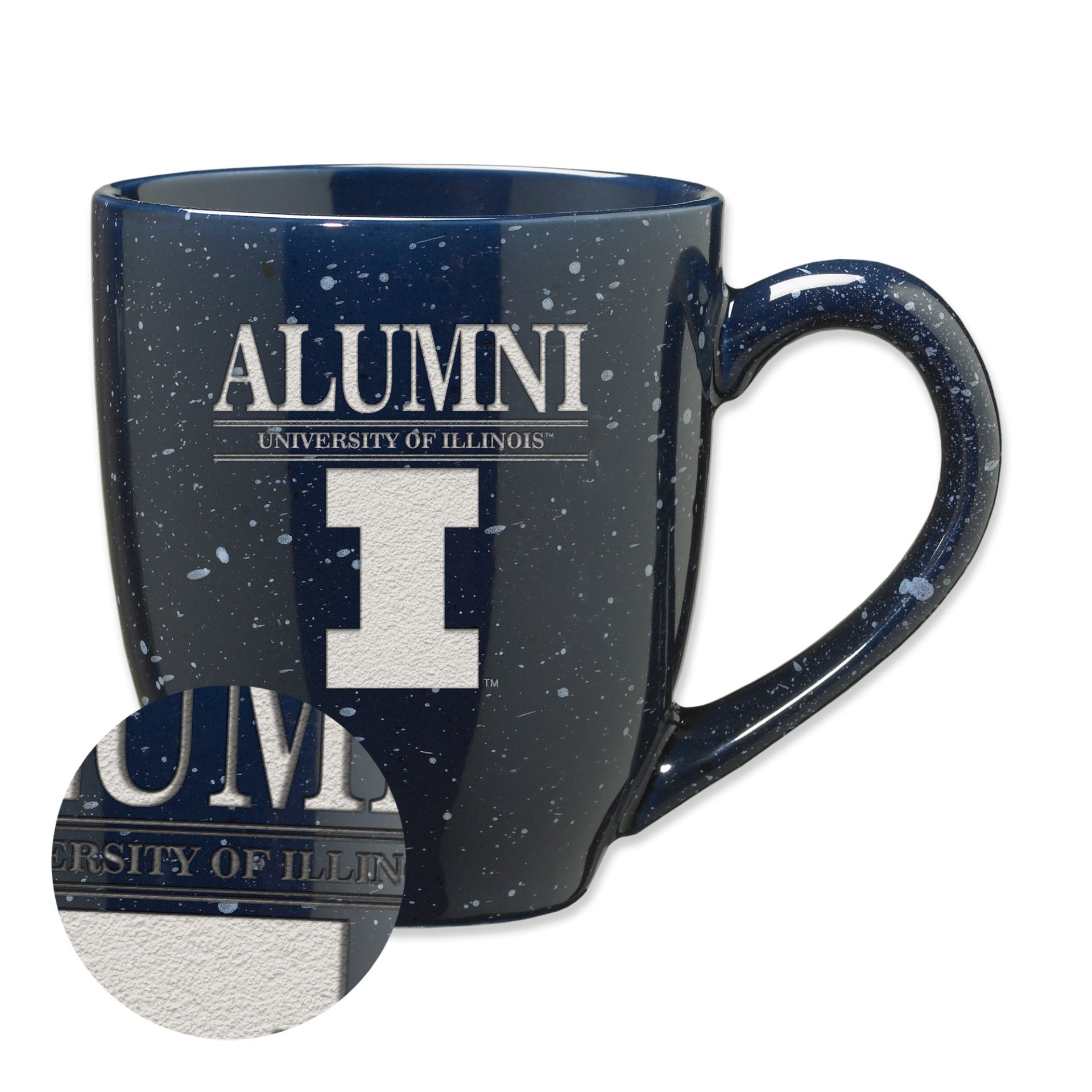 Go Illini! This Illinois Alumni mug is perfect for celebrating any U of I grad! This 16oz mug features a speckled navy body with an engraved "University of Illinois Alumni" and Block I that will really make your Illinois spirit shine through! This is an officially licensed collegiate product.