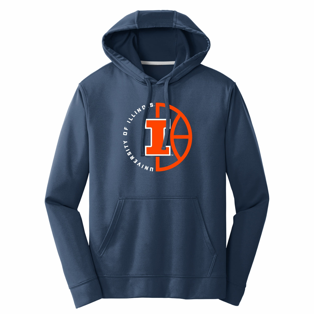 Go Illini! This Illinois Basketball hoodie is perfect for wearing around campus or to games. This men's pullover features a navy fleece body with an orange and white University of Illinois/Block I basketball design on the front. This hoodie is great for showing your Fighting Illini spirit! This is an officially licensed collegiate product.