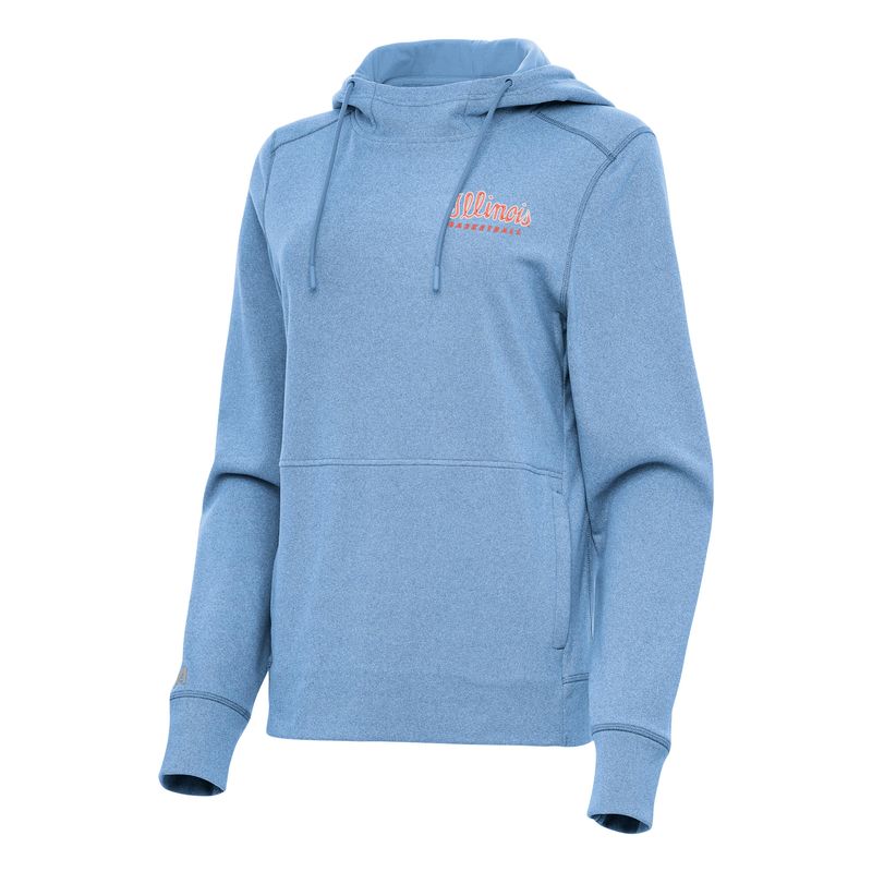 I-L-L! Pick up this women's Illinois Basketball hoodie to impress your friends! Once they see you wearing this Antigua hoodie, they’re going to want one too! This comforable pullover features a light blue body with an orange and white script "Illinois" over an orange "Basketball" on the front left perfect for showing your Illini spirit at games, tailgates, or just around campus. This is an officially licensed collegiate product.