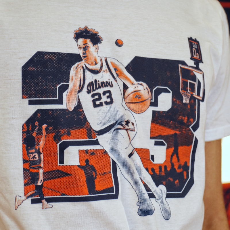 Go Illini! This one-of-a-kind Keaton Wagler NIL t-shirt is perfect for wearing around campus or to games. This Illini Basketball shirt features a white background with unique art that captures Keaton's unforgettable half-court buzzer-beater from the Orange Out game against Northwestern. This Gameday Spirit exclusive, limited-time, special drop is great for showing your Fighting Illini spirit! This is an officially licensed collegiate product.