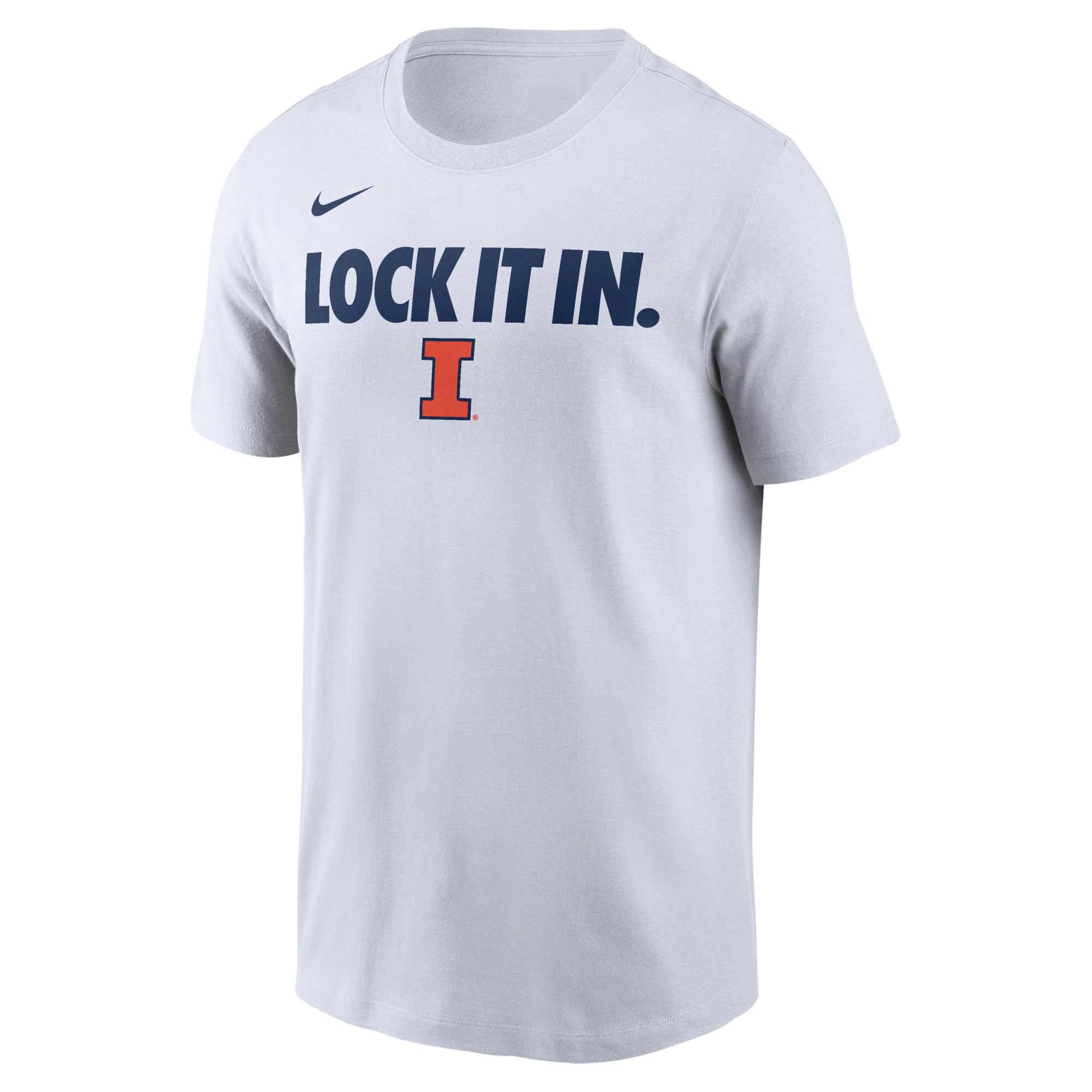 It's HERE! The 2026 Postseason Bench Tee is now available! This Illinois Basketball shirt is perfect for wearing around campus or to games. This official on-court bench tee features a white body with a navy "LOCK IT IN" over an orange/navy Block I. This Fighting Illini Basketball shirt is great for showing your orange and blue spirit! This is an officially licensed collegiate product.