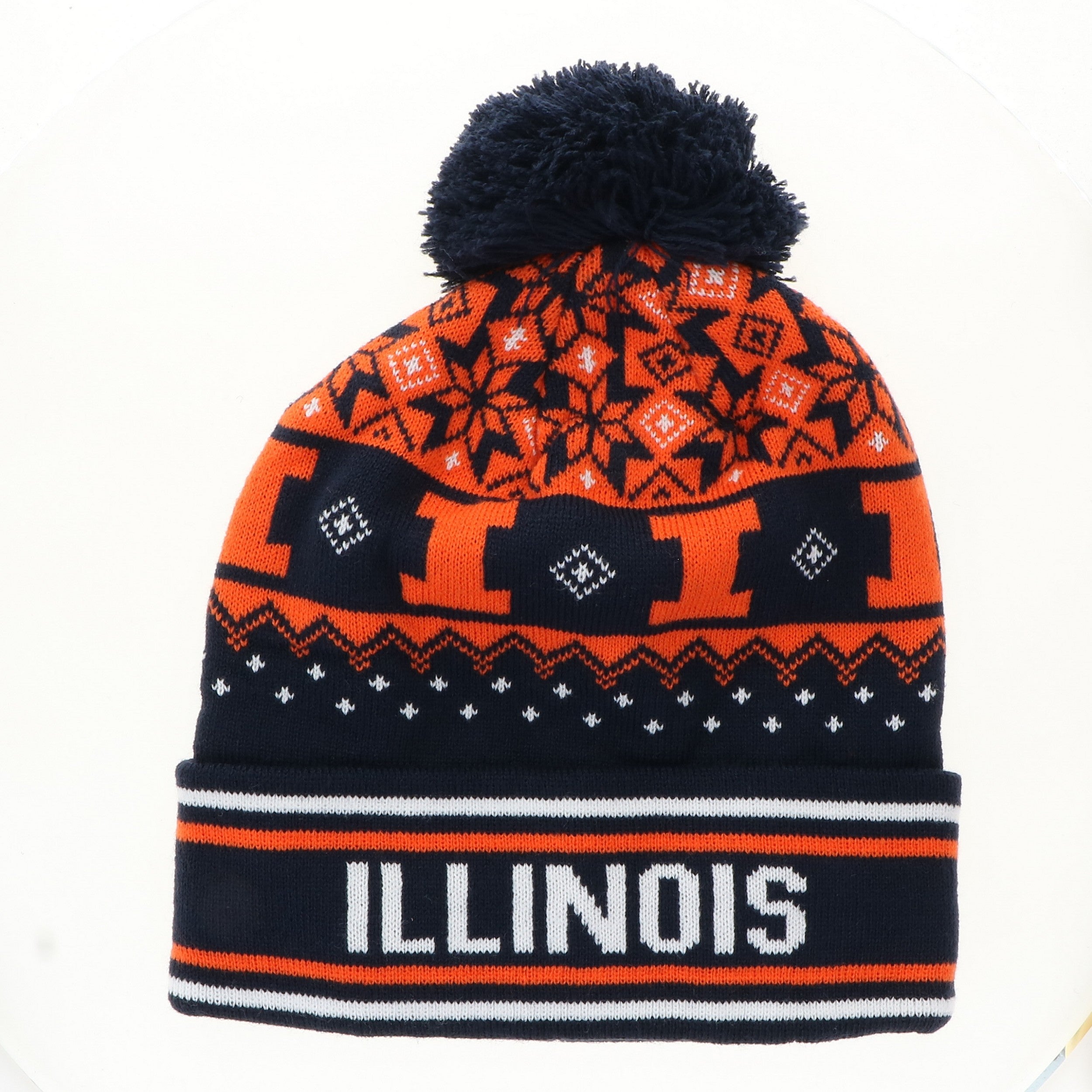 ILL-INI! Gear up for game day with this Illinois beanie. This winter hat features a navy/orange snowflake, Block I, and sweater pattern alongside a white "Illinois" on the cuff and a navy pom that Illini fans will love. Show your school spirit with this new Illinois hat and cheer on the team in style! This is an officially licensed collegiate product.