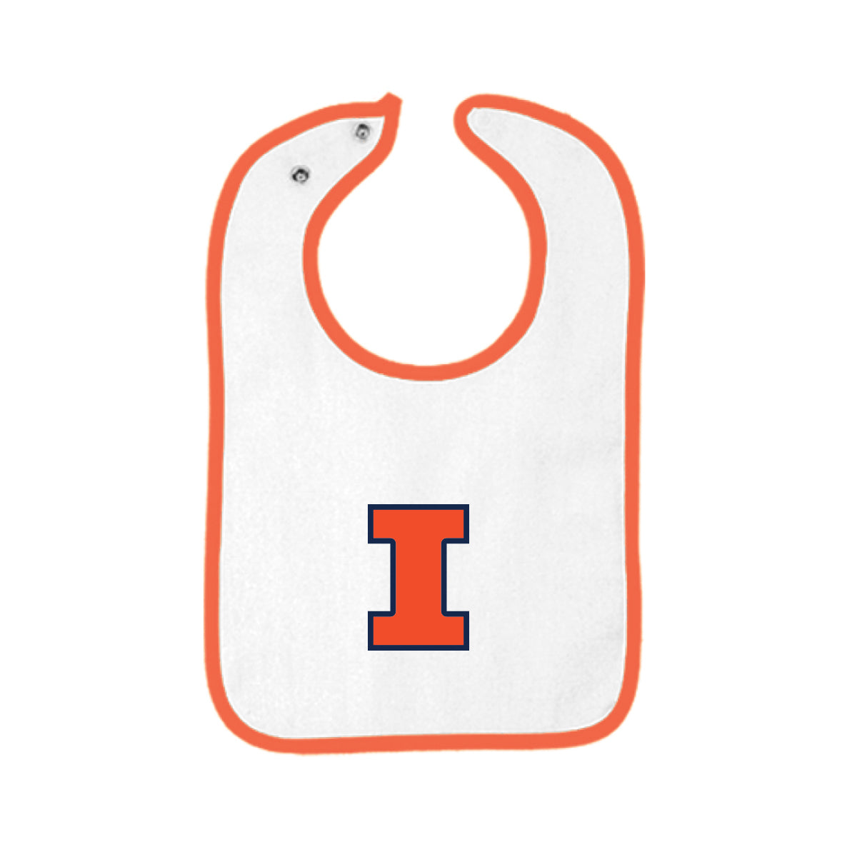 Show your Orange and Blue pride! This Illinois bib is perfect for any little Illini fan. This bib features a white terry body with an orange Block I and trim that makes it great for your little one. Don’t miss out on this bib to show your Fighting Illini spirit! This is an officially licensed collegiate product.