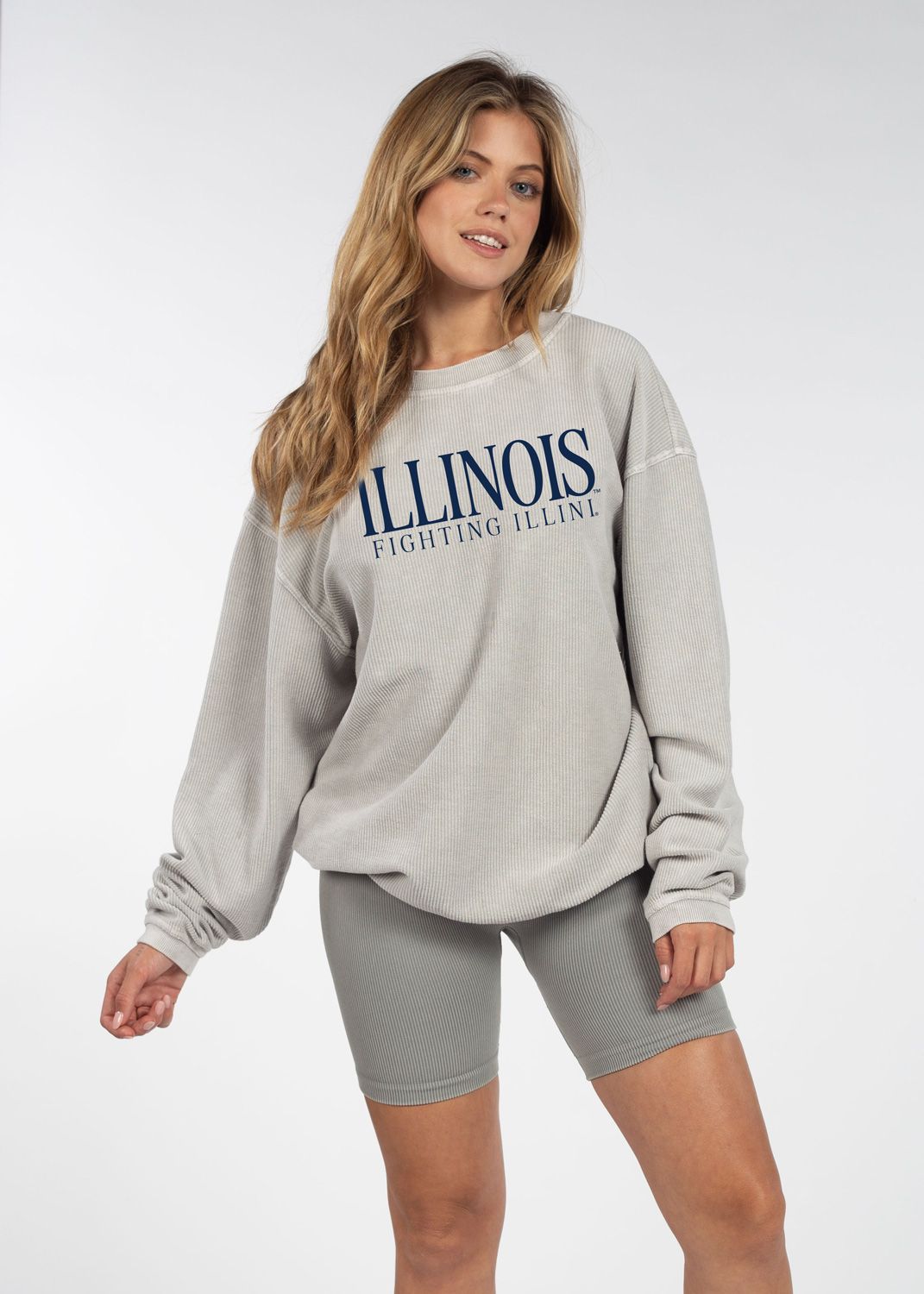 Go Illini! This Illinois corded crew is perfect for wearing around campus or to games. This Chicka d pullover features a grey body, with a navy decoration. This corded crew is great for showing your Fighting Illini spirit! This is an officially licensed collegiate product.