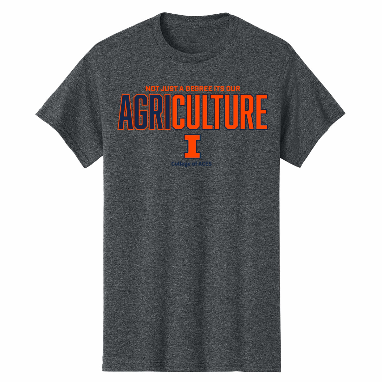 Hail to the orange! This Illinois ACES shirt is a great way to show your Fighting Illini spirit! This BOGO tee features a dark grey heather body with an orange "Not Just a Degree It's Our AgriCULTURE" design on the front that is great for showing your ACES pride. Make sure to pick up this new U of I ACES merch to show off your Illini pride! This is an officially licensed collegiate product.