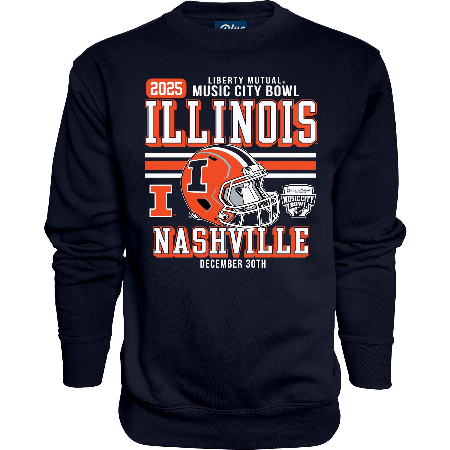 Go Illini! This Illinois Football 2025 Music City Bowl sweatshirt is perfect for wearing around campus or to games. This Fighting Illini Football crewneck features a navy body with an orange/white Liberty Mutual Music City Bowl design on the front. This Illinois Football bowl merch is great for showing your Fighting Illini spirit! This is an officially licensed collegiate product.
