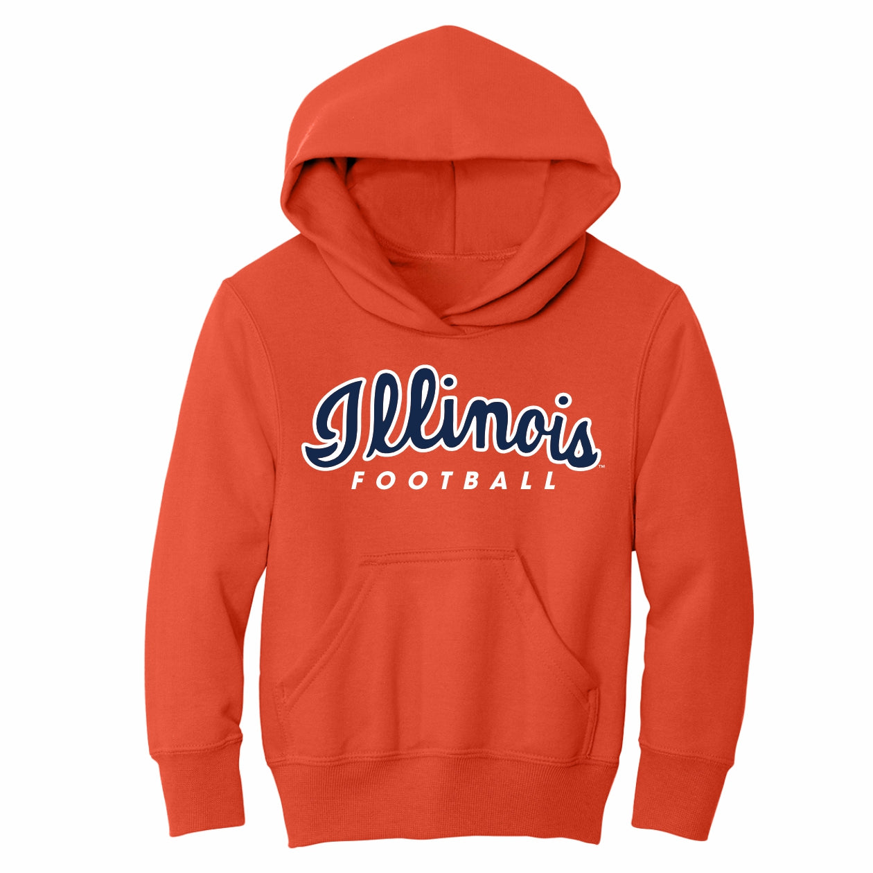 I-L-L! Pick up this Illinois Football hoodie to really show your kiddo's Illini spirit! This kids hoodie features an orange body with a navy and white script "Illinois" above a white "Football" that will make an unforgettable addition to your kiddo's Illini wardrobe! Get one online or in-store today! This is an officially licensed collegiate product.