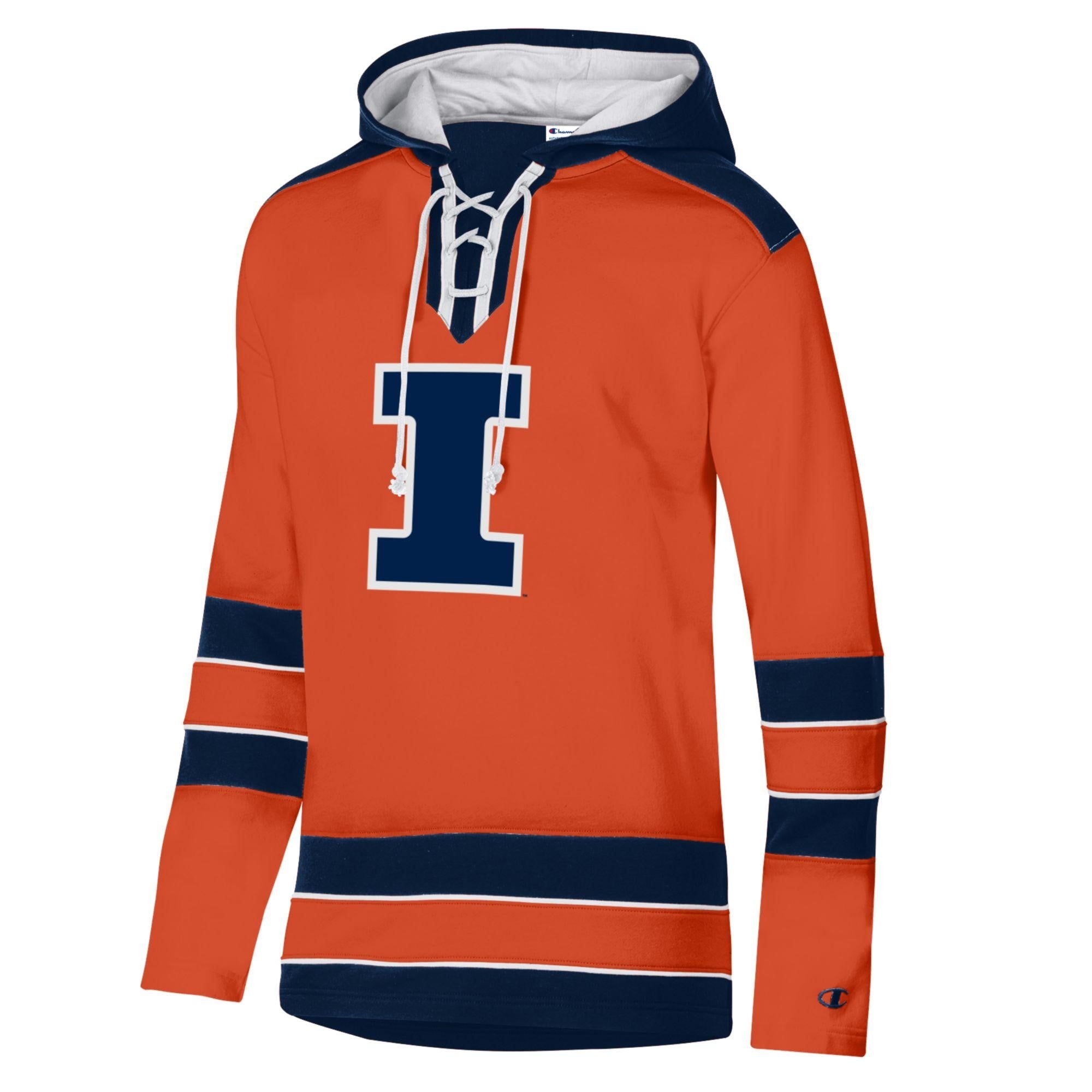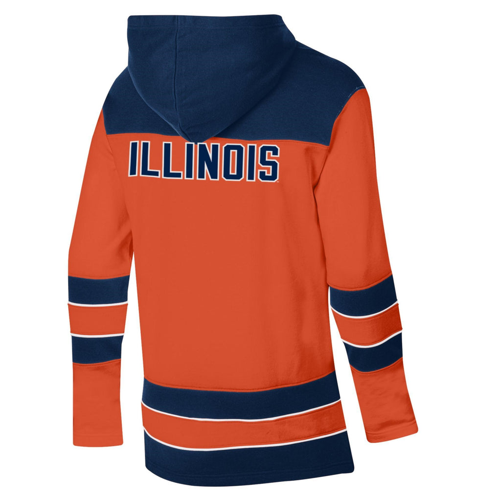 Hail to the orange! This Illinois hockey jersey is a great way to show your Fighting Illini spirit! This hooded jersey features an orange body with navy stripes on the sleeves/torso, a navy Block I on the front, and a navy Illinois/hood on the back that make it great for any occasion. Make sure to pick up this Illinois hoodie to show off your Illini pride! This is an officially licensed collegiate product.