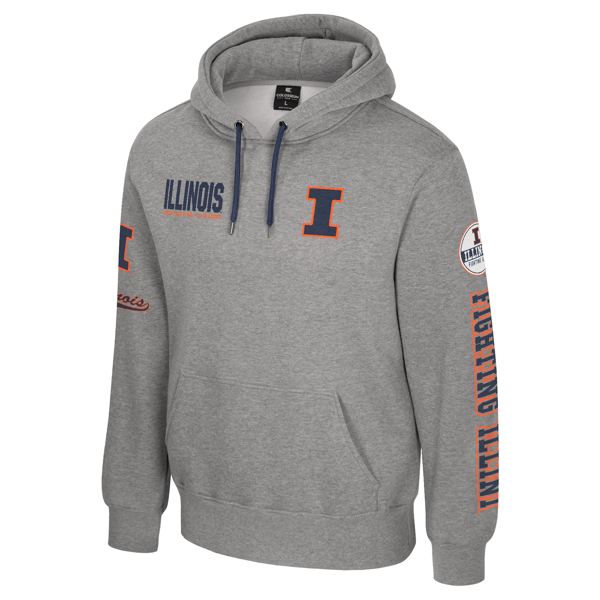 ILL-INI! Gear up for game day with this Illinois hoodie. This men's fleece pullover features a grey body with a variety of orange and blue Illinois logos across the chest and sleeves that Illini fans will love. Show your school spirit with this new Illini hoodie and cheer on Illinois in style! This is an officially licensed collegiate product.
